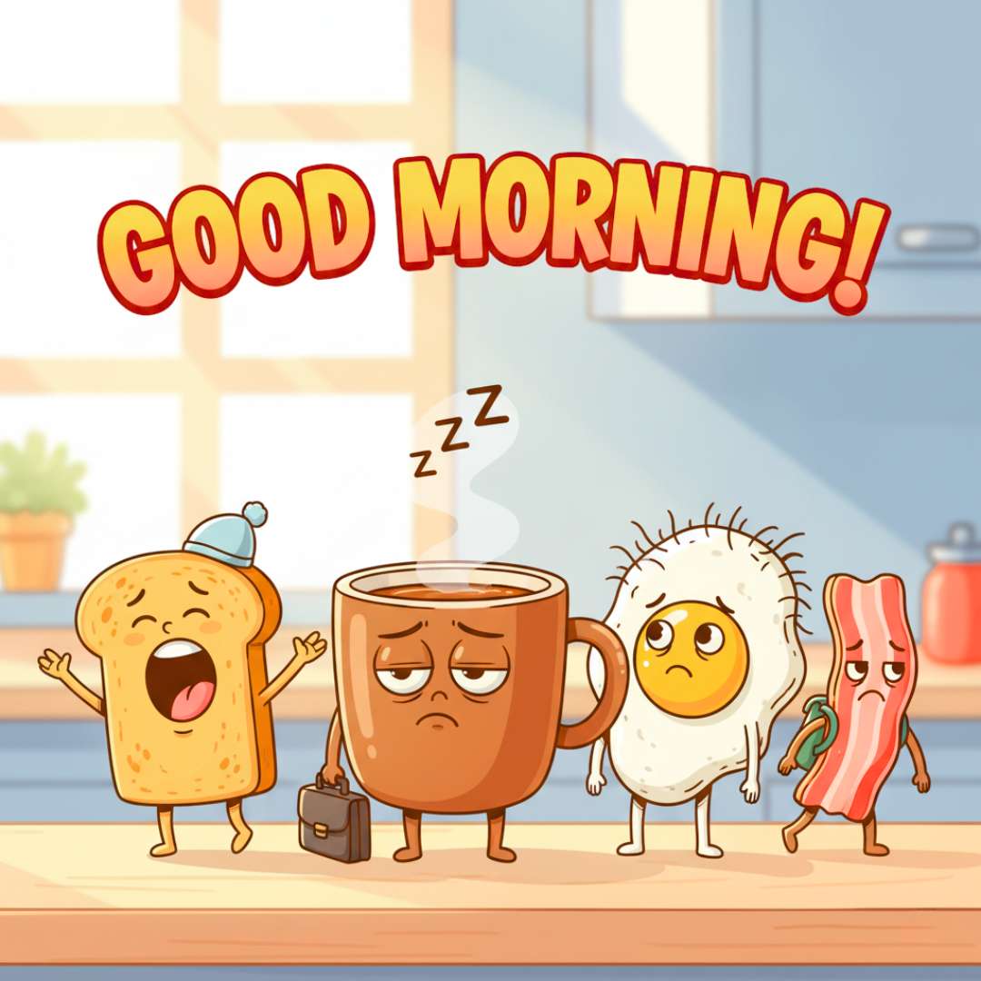 This Funny Morning Image features various breakfast items like bread, meatloaf, and a fried egg, each with cute, sleepy, and sad faces, perfectly capturing a lazy morning mood. To make it even funnier, a coffee cup with a bag is included, as if it’s ready to start the day. Above the scene, “Good Morning” is written in a beautiful and stylish font, creating a playful and cheerful image that’s perfect for sharing morning smiles.