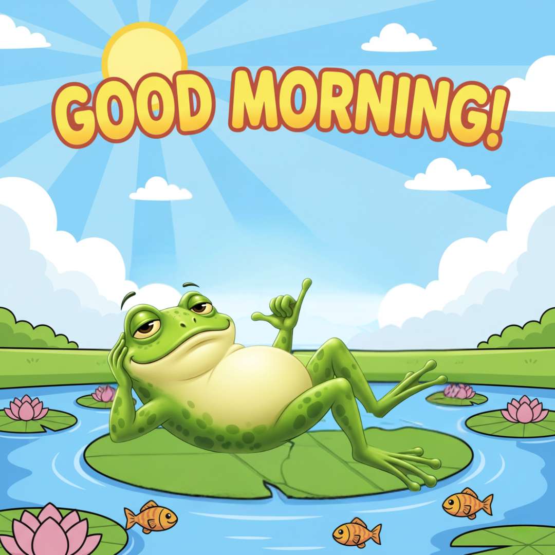 This Good Morning Funny Image features a goofy frog striking a hilarious pose while sitting on a leaf in a pond, surrounded by colorful flowers and playful fishes. Above the scene, the bright sun shines, adding a cheerful morning glow. The words “Good Morning” are written in a stylish font, completing the lively and funny composition. The frog’s comical expression and playful setting make this image a perfect way to share joy and laughter at the start of the day.