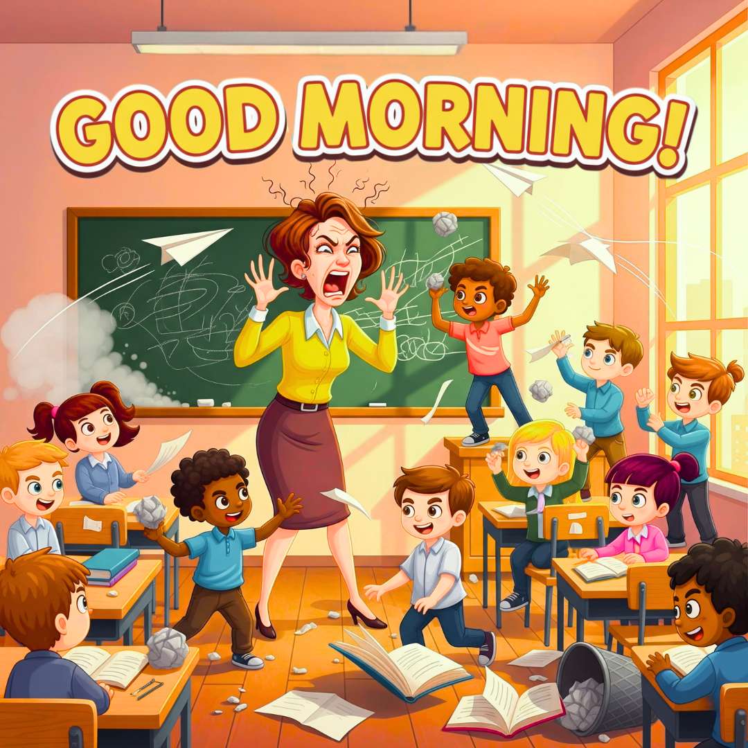This Good Morning Funny Photo features a chaotic classroom scene where kids are playing, laughing, and doing all sorts of silly things, while a frustrated teacher is yelling at them to stop. The lively and messy atmosphere perfectly captures the energy of a wild school morning. At the top, “Good Morning” is written in a stylish font, adding a cheerful touch to the funny scene. This Good Morning Funny Photo is perfect for sharing with school teachers or anyone who can relate to the madness of handling playful kids in the morning.
