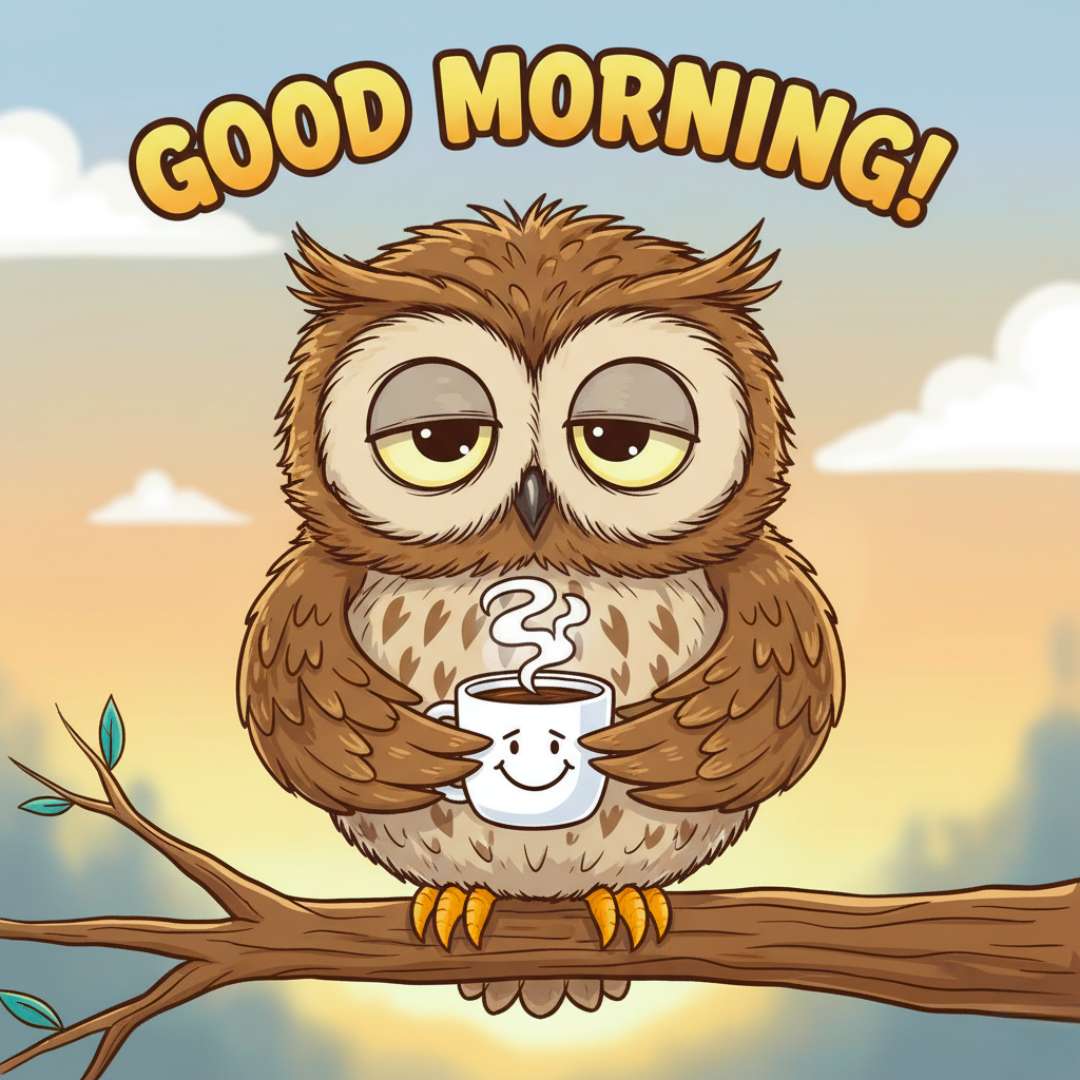 This Good Morning Funny Pic features a sleepy-eyed owl holding a coffee cup, perfectly capturing the classic “just woke up” mood. Above the scene, “Good Morning” is written in a cute and stylish font, adding a cheerful touch. The combination of the owl’s tired expression and the cozy coffee vibe makes this image a fun and adorable way to share a morning greeting.