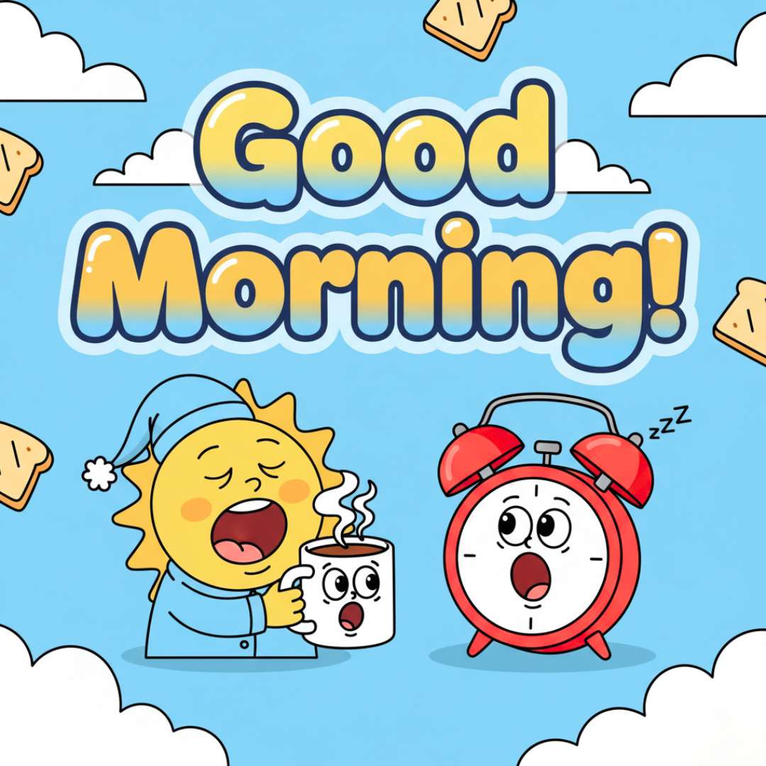 This Good Morning Funny image features a lively alarm clock ringing loudly, trying to wake up a sleepy sun that’s already sitting back with a steaming cup of coffee in hand. The sun’s drowsy expression and relaxed pose create a humorous contrast to the energetic clock. Above the scene, “Good Morning” is written in a stylish, eye-catching font, adding a cheerful touch. The playful interaction between the clock and the sun gives the image a fun, lighthearted morning vibe — perfect for sharing a smile at the start of the day.