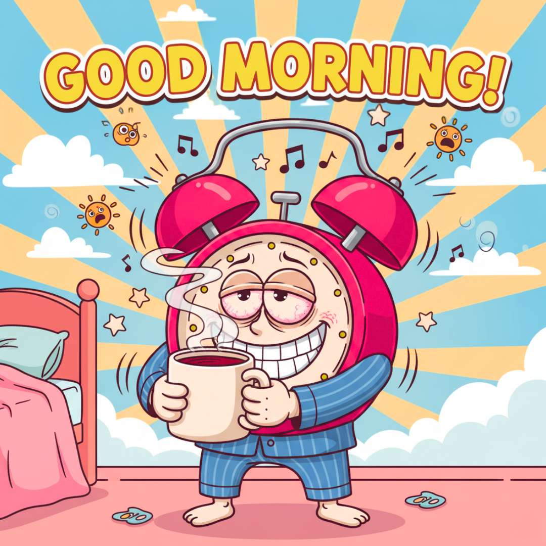 This Happy Good Morning Funny Image features a ringing alarm clock with red, sleepy eyes, standing near a bed while holding a cup of tea, trying to wake itself up. The clock forces a big, toothy smile, but it’s clear it’s still struggling to fully wake up, creating a hilariously relatable scene. Beside it, a small surprised sun with a funny face adds extra charm. Above the scene, “Good Morning” is written in a stylish font, making this image perfect for sharing a cheerful and funny morning greeting.