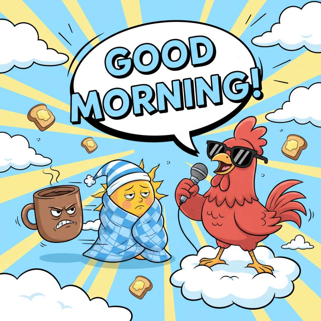 This Hilarious Good Morning Image features a rooster standing proudly on a cloud, holding a microphone to announce “Good Morning” in his classic crowing voice. Beside him, a funny-faced sun wearing a sleeping cap and wrapped in a blanket looks half asleep, adding a comical twist to the scene. To top it off, a grumpy coffee cup with an angry face watches the moment unfold, making the image even funnier. The playful characters and humorous details make this scene a perfect way to share a lighthearted Good Morning greeting.