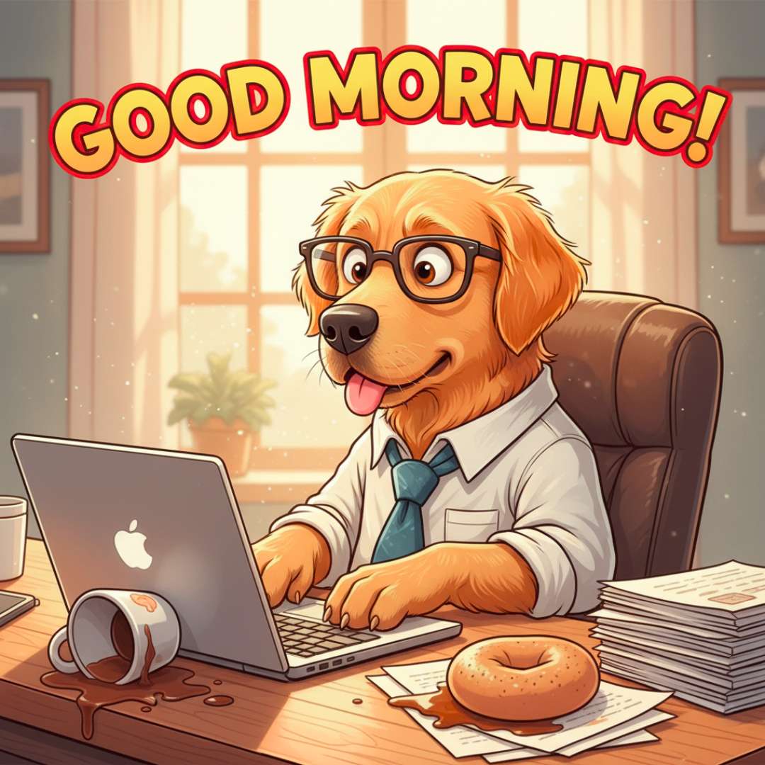 This Morning Funny Image features a cute-faced character with a hilarious expression, wearing glasses and a tie, working on a computer while holding a coffee cup that’s spilling coffee. A donut rests on a piece of paper, adding to the funny office vibe. Above the scene, “Good Morning” is written in a beautiful, stylish font, making this image a perfect and playful way to share cheerful morning greetings.