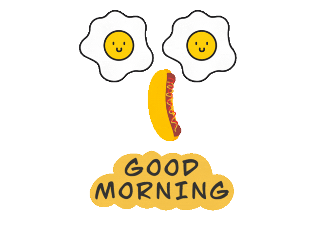 This Good Morning Animation GIF features a playful breakfast face made of two fried eggs as eyes and a hotdog as the nose. The phrase “Good Morning” zooms in and out, forming a smiling mouth, creating a fun and quirky animated greeting to brighten the day.