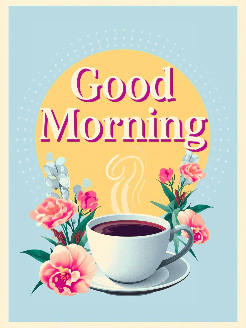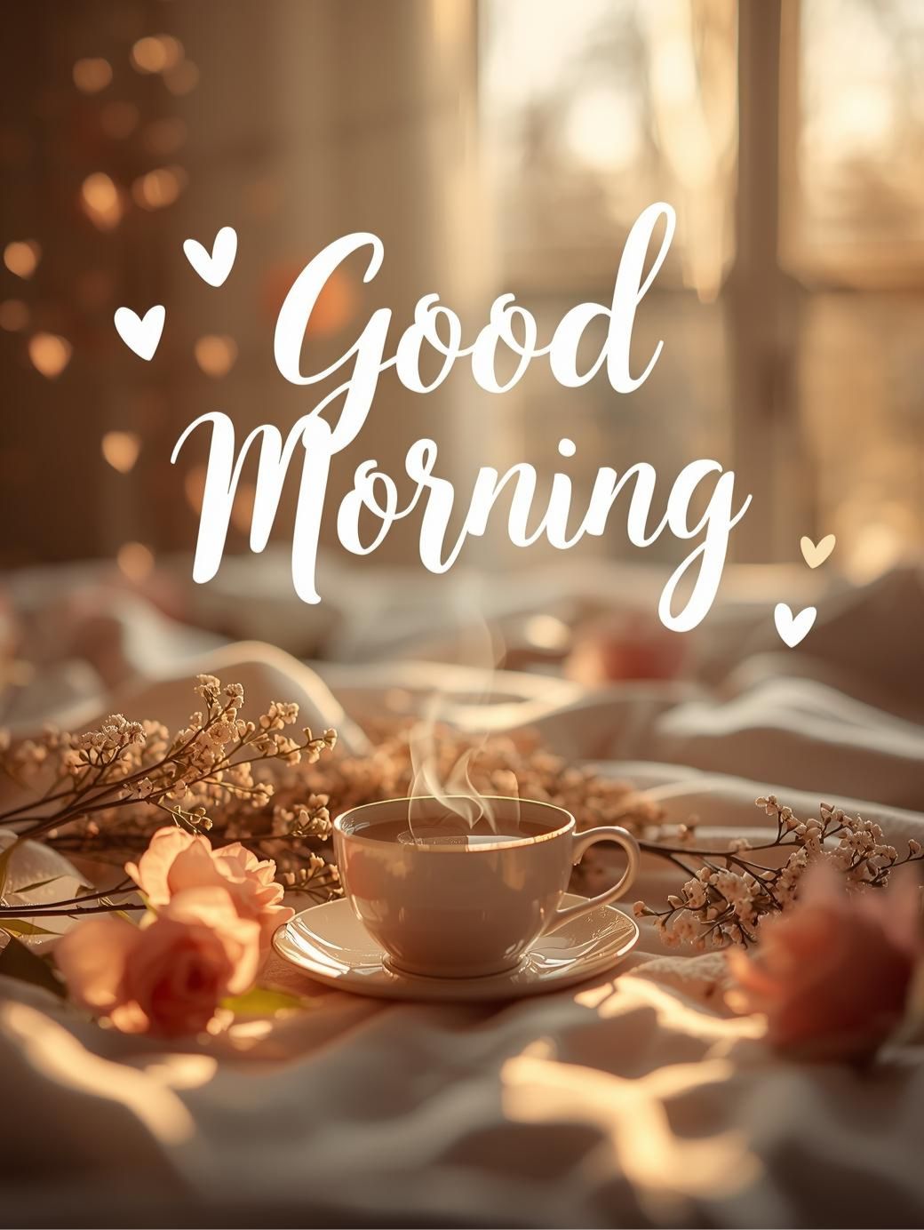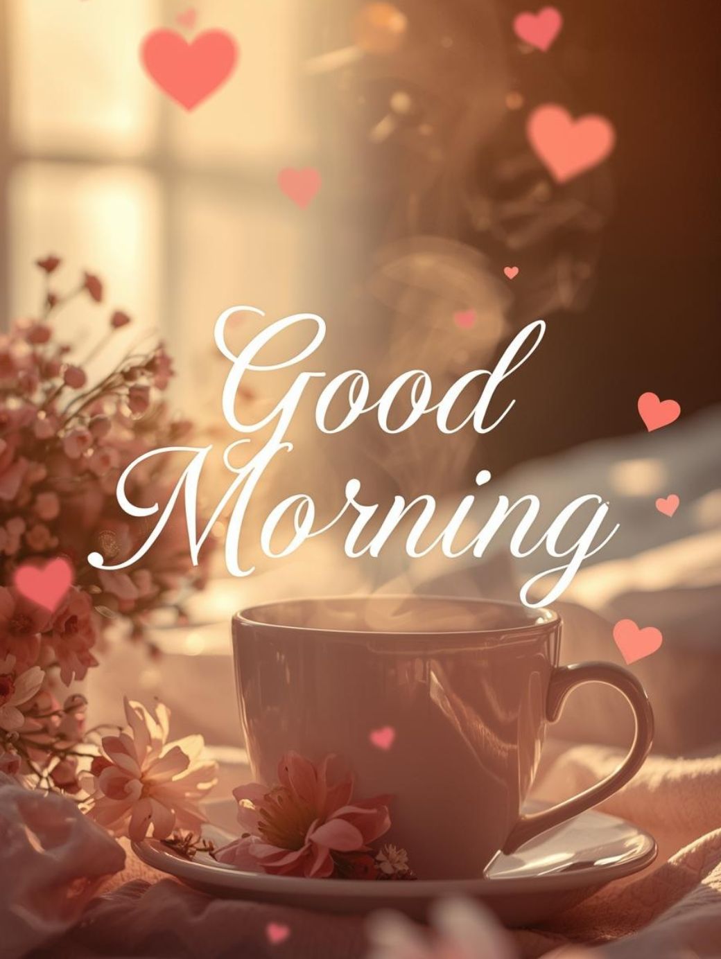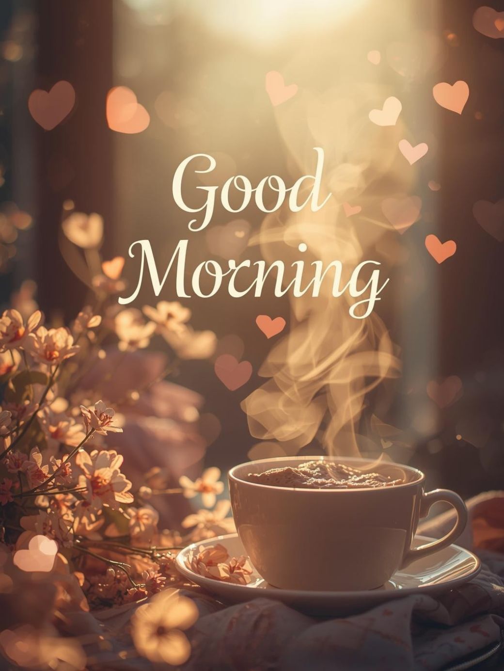This Good Morning image captures a sweet, soothing moment meant to be shared with someone close to your heart. Simple elements like blooming flowers, a warm cup of coffee, sunlight filtering in, and delicate heart accents create a calm and affectionate vibe. The graceful “Good Morning” text blends beautifully with the scene, while the soft colors and gentle light spread a feeling of comfort, kindness, and positivity—making it a lovely way to start the day for family, friends, or someone special.