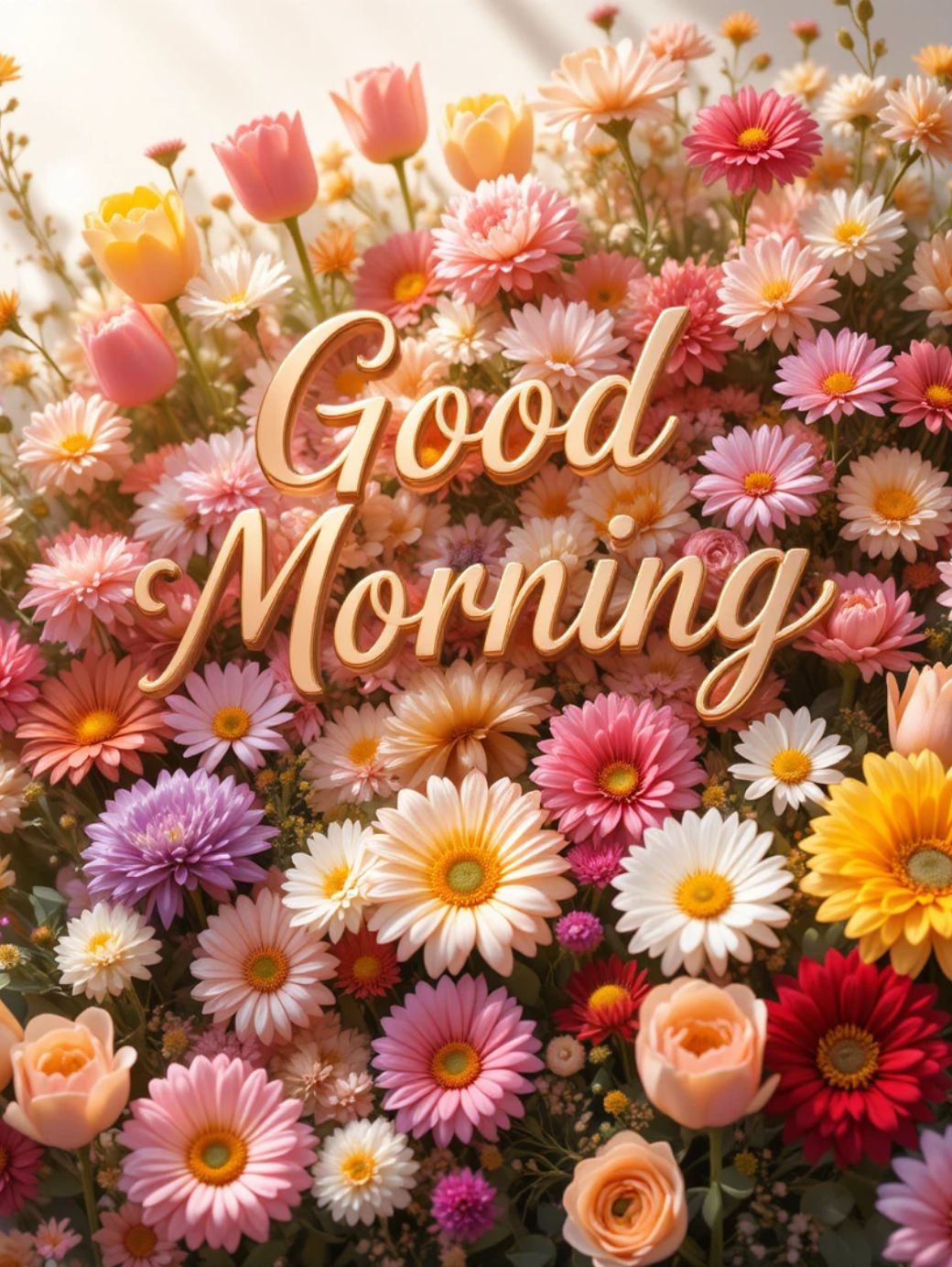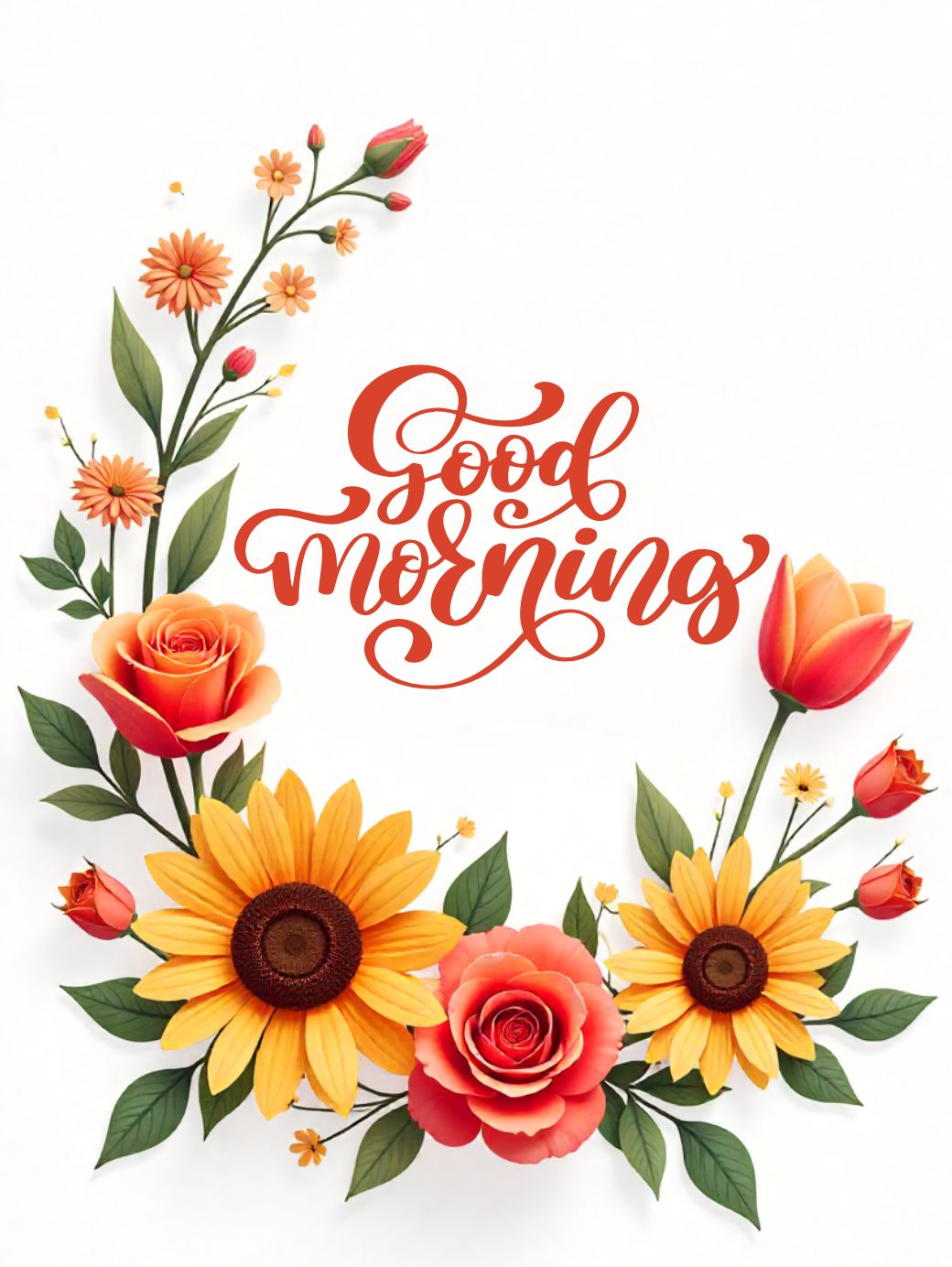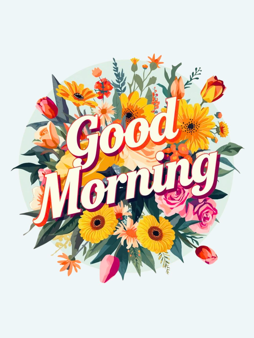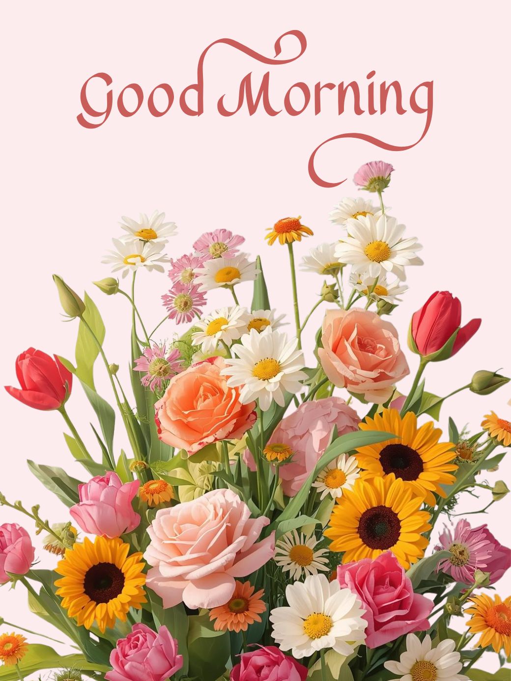 This Good Morning image features a vibrant and beautiful arrangement of fresh flowers, including roses, tulips, daisies, and sunflowers, elegantly displayed to create a bright and peaceful scene. Bathed in a gentle morning glow against a clean background, the image exudes calmness and freshness. The “Good Morning” text is presented in a stylish, readable font that harmonizes naturally with the floral design. With its vibrant yet soothing colors, the image radiates warmth, cheerfulness, and positivity, making it perfect for sharing as a delightful morning greeting.