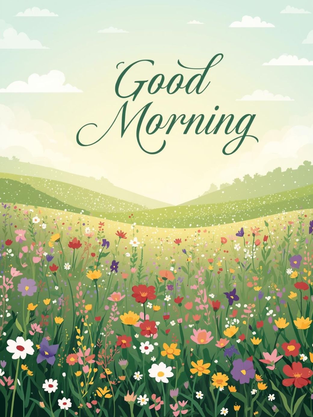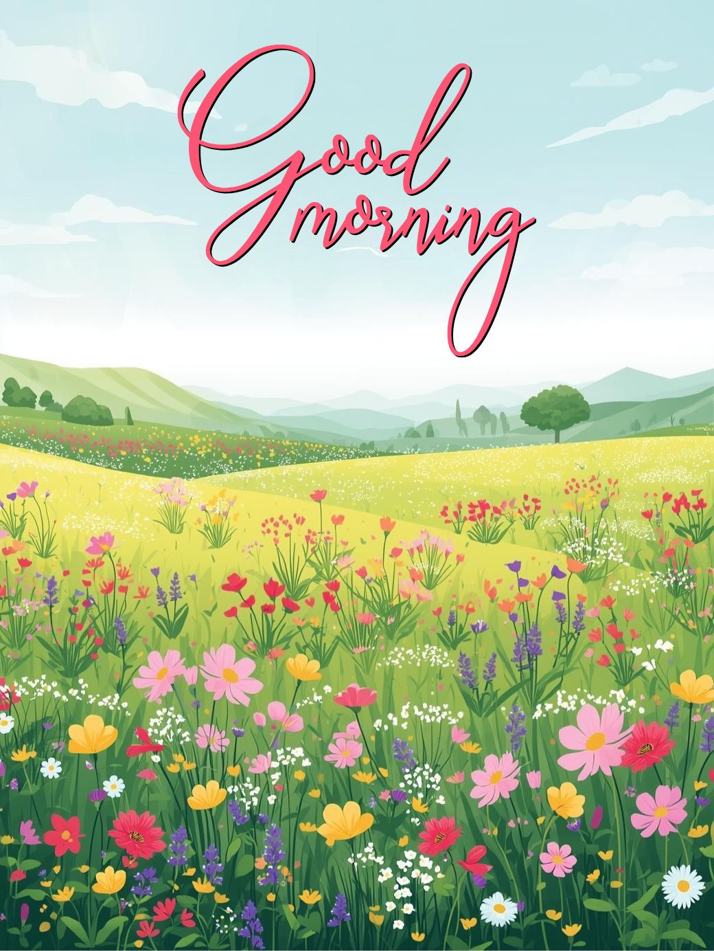 This Good Morning image captures the feeling of a fresh new day in an open meadow bursting with colorful blooms. Soft sunlight spreads across the landscape, while the clear sky and light clouds bring a calm, refreshing touch. The “Good Morning” message blends smoothly into the scenery, and the balanced mix of lively and gentle colors creates a warm sense of joy, positivity, and peaceful energy—ideal for sharing a cheerful start to the day.