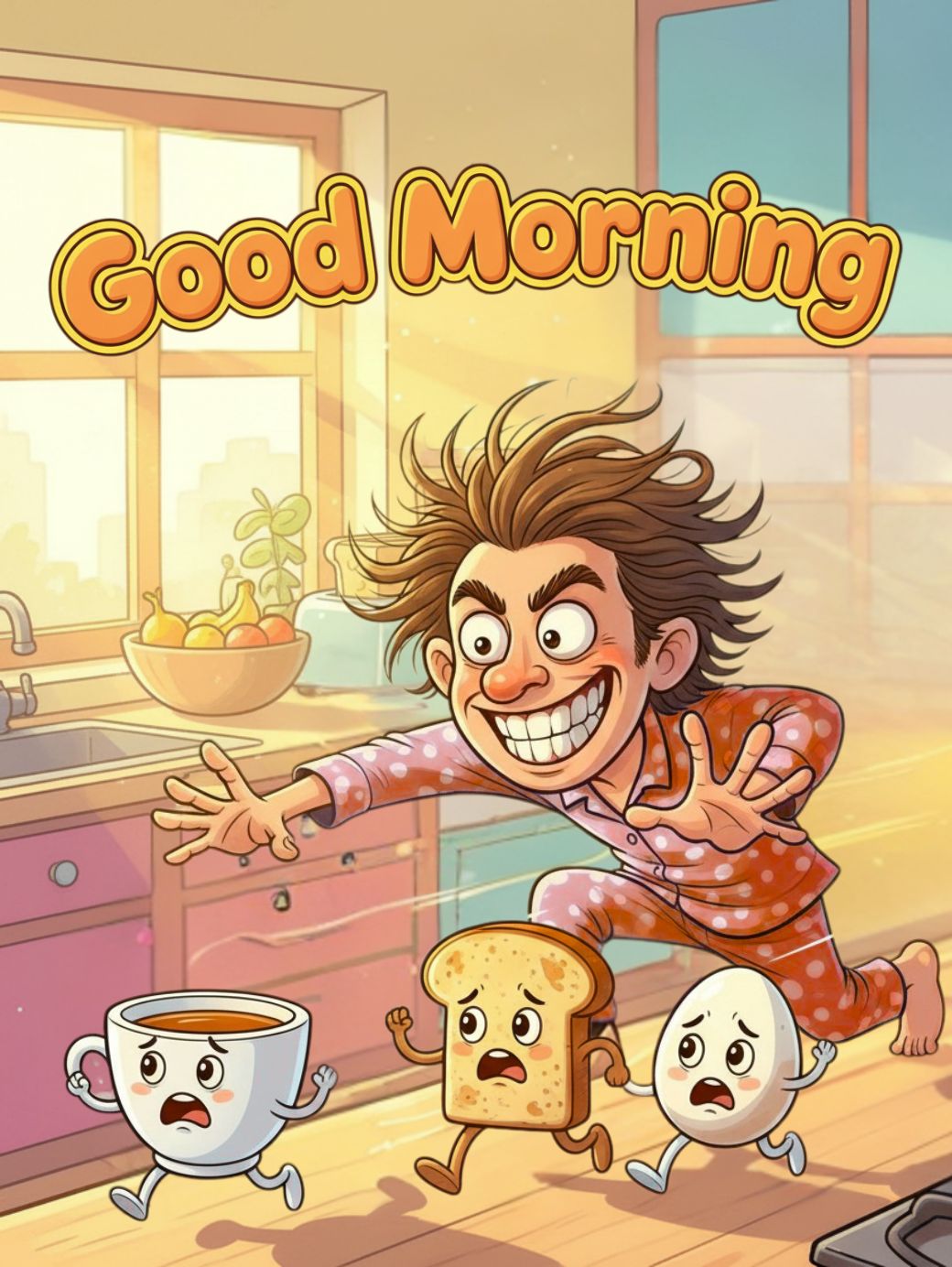 This funny Good Morning image shows a cartoon person with an over-the-top hungry expression chasing a cup of tea, a slice of bread, and an egg—each with cute faces and tiny legs, running away in confusion. The bright colors, playful kitchen setting, and bubbly “Good Morning” text create a silly, energetic scene that’s full of laughter and perfect for starting the day with a smile.