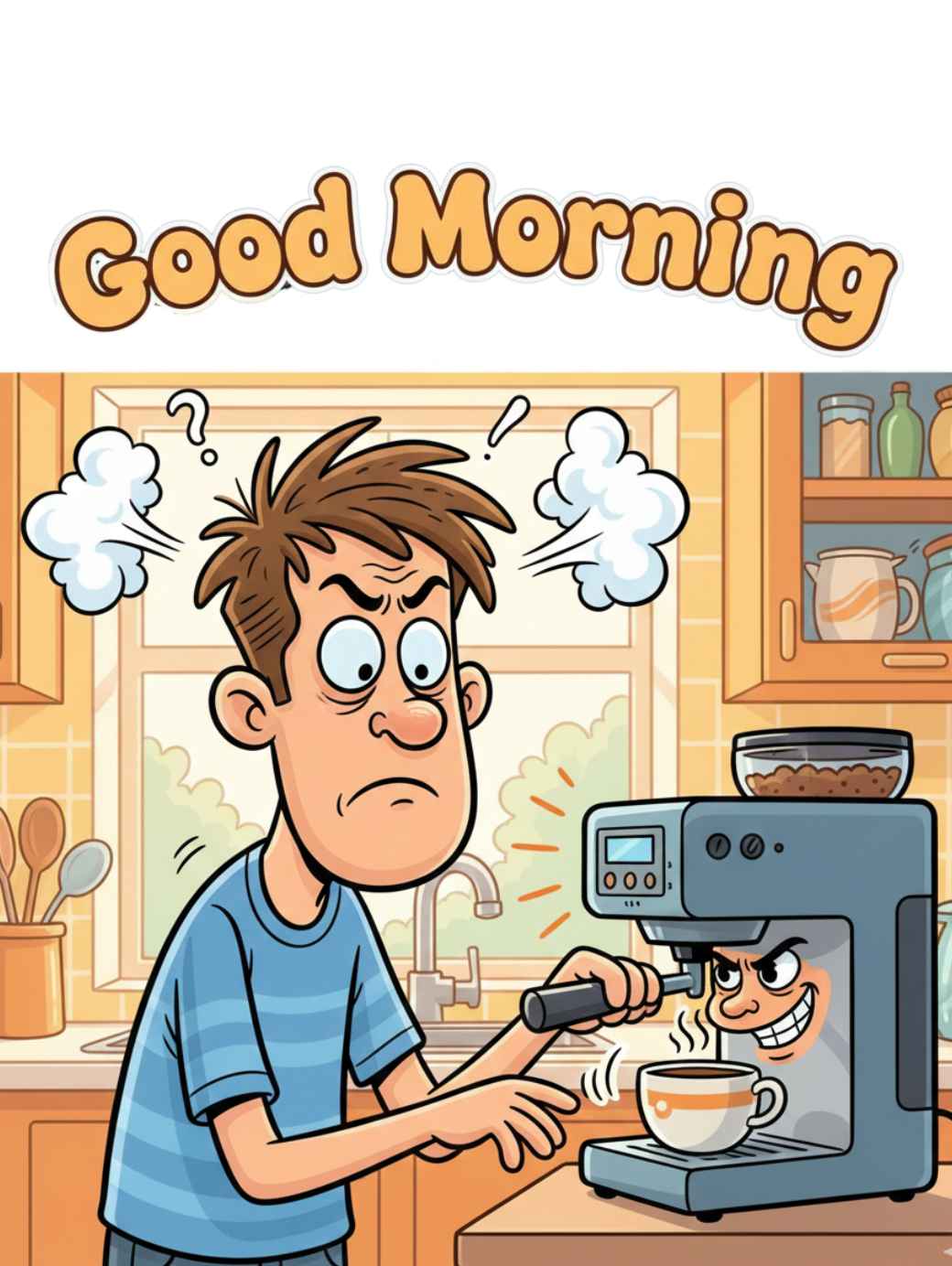 This Good Morning Funny Image shows a frustrated person standing in front of a coffee machine that refuses to work. The machine has a mischievous face, grinning as if it’s teasing, while the person looks annoyed and confused with messy hair and steam rising from their head. The bright cartoon colors, playful details, and bold “Good Morning” text make the scene lively, relatable, and perfect for sharing with coffee lovers who can’t start their day without caffeine.