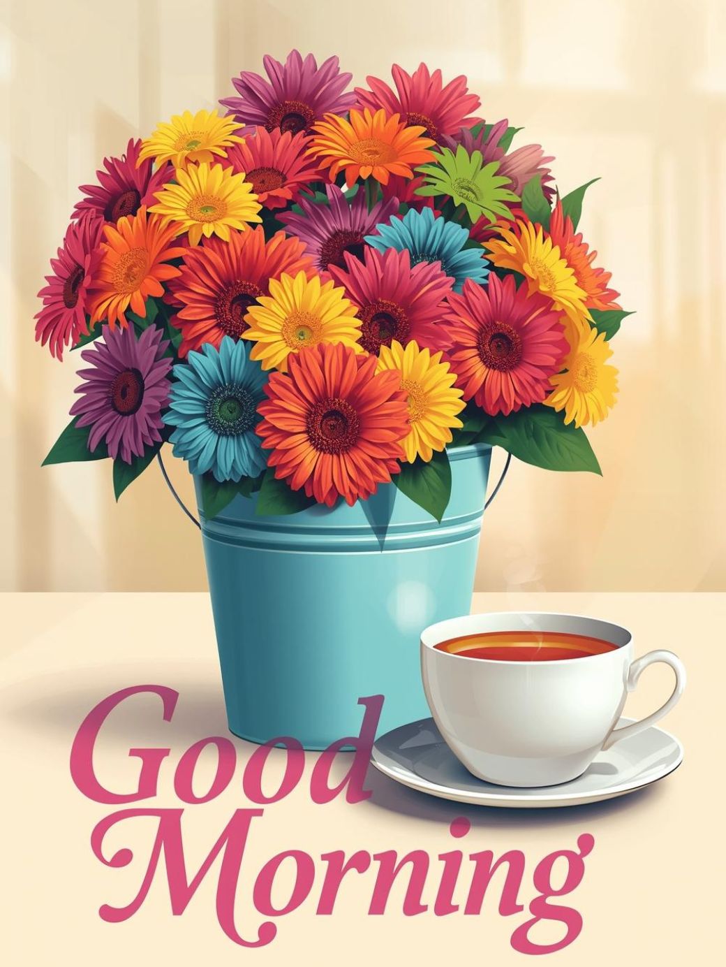 This Good Morning Greetings Image features a colorful flower bucket paired with a warm cup of coffee, creating a refreshing and uplifting scene. The bright flowers and cozy coffee together spread positivity and cheerful Good Morning vibes, making it a perfect way to start the day beautifully.