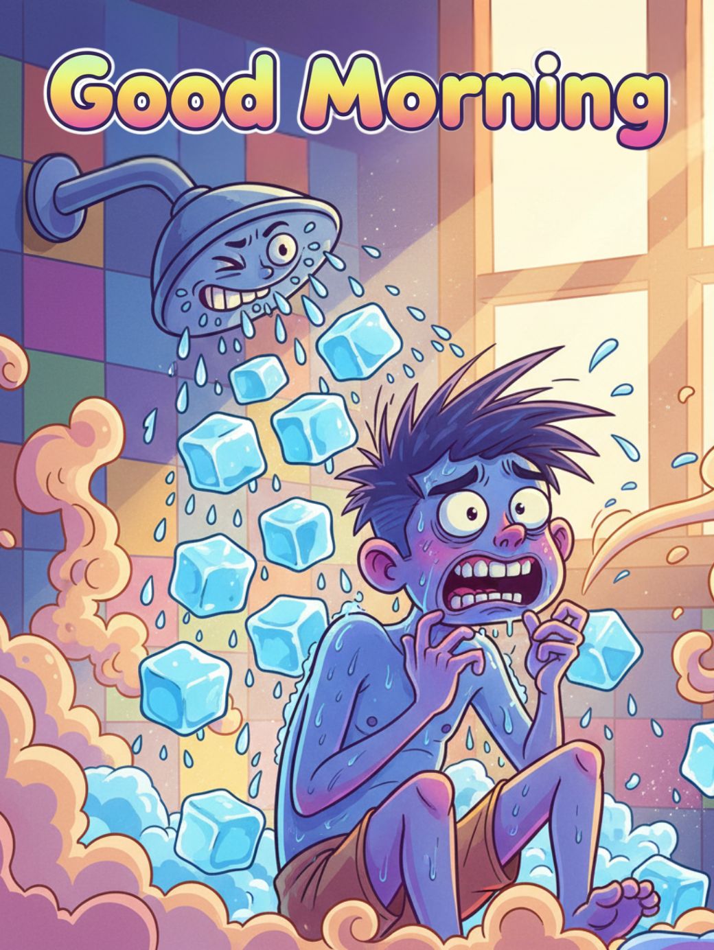 This Good Morning Humor shows a person taking a shower while icy cubes fall instead of water. The person shivers with wide eyes, chattering teeth, and a dramatic, exaggerated pose, while the mischievous showerhead adds to the humor. With bright, lively colors and playful “Good Morning” text, the scene is silly, energetic, and cheerful—perfect for sharing with friends or on social media to start the day with a laugh.