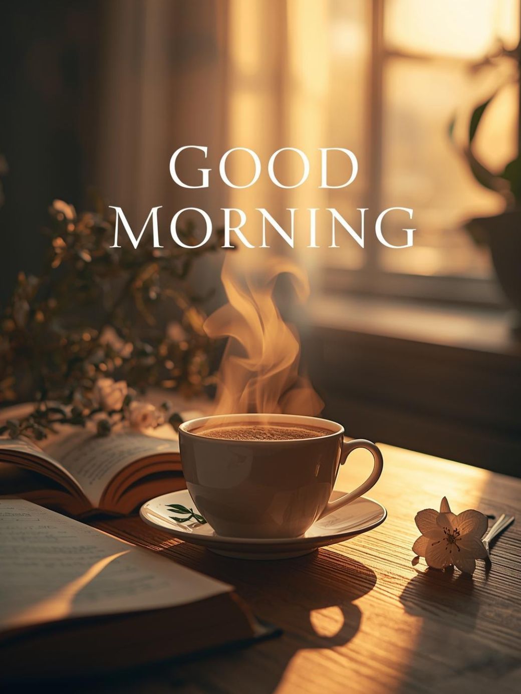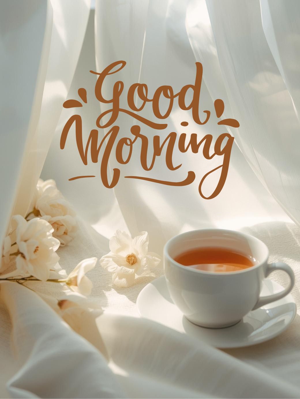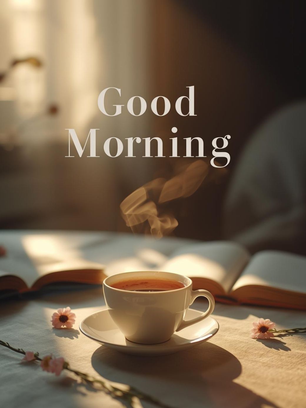 This Good Morning image shows a cozy, inviting scene with a fresh cup of tea and gentle steam rising. Soft golden sunlight fills the space, highlighting subtle touches including a small flower, a book, or a clean table. The elegant “Good Morning” text and warm, soothing colors create a peaceful, comforting vibe, perfect for a calm and refreshing start to the day.