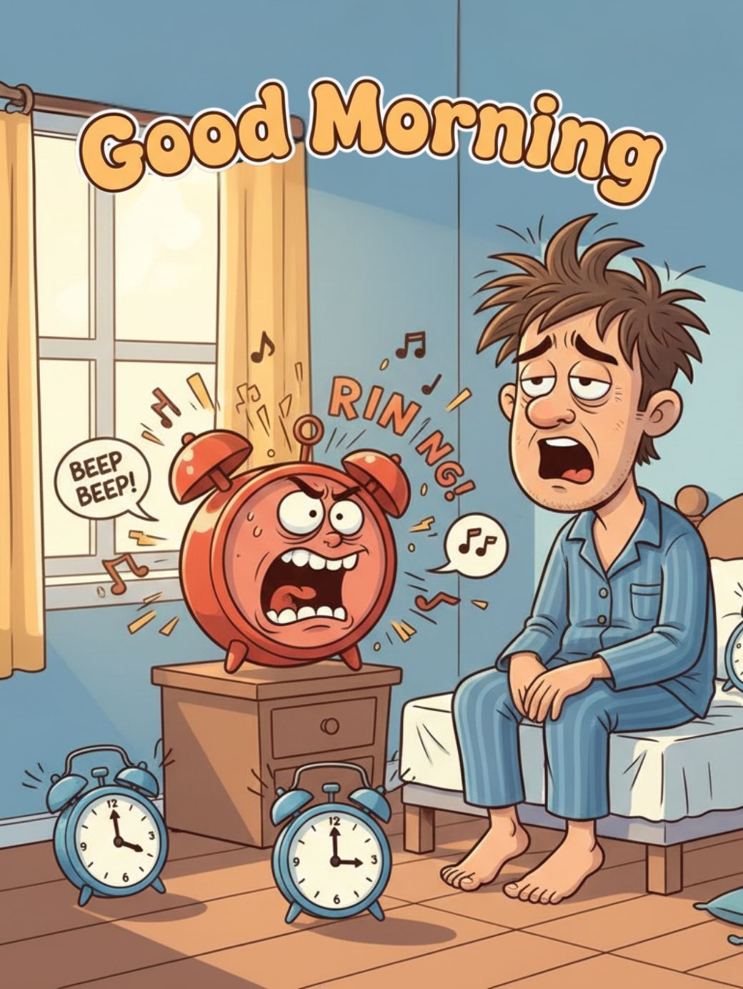 This Humorous Good Morning Image shows a sleepy man sitting on the edge of his bed while alarm clocks ring loudly all around him. With messy hair, droopy eyes, and a confused, annoyed expression, it perfectly captures the struggle of waking up. The bright cartoon style and playful “Good Morning” text make it light and cheerful—ideal for sending to friends, coworkers, or anyone who hates early mornings and loves a good laugh.