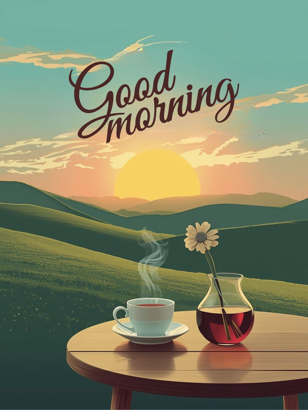 This Inspirational Good Morning Image captures a calm and refreshing morning scene inspired by nature, featuring a peaceful sunrise over green hills with soft, drifting clouds. A small wooden table holds a fresh cup of tea and a single flower in a glass vase, adding a touch of simplicity and charm. Bathed in warm morning light with pastel sky colors, the clean, minimal composition conveys tranquility and freshness. The elegant “Good Morning” text in a soft, readable font complements the serene scene, creating an uplifting and peaceful image perfect for sharing gentle morning greetings.