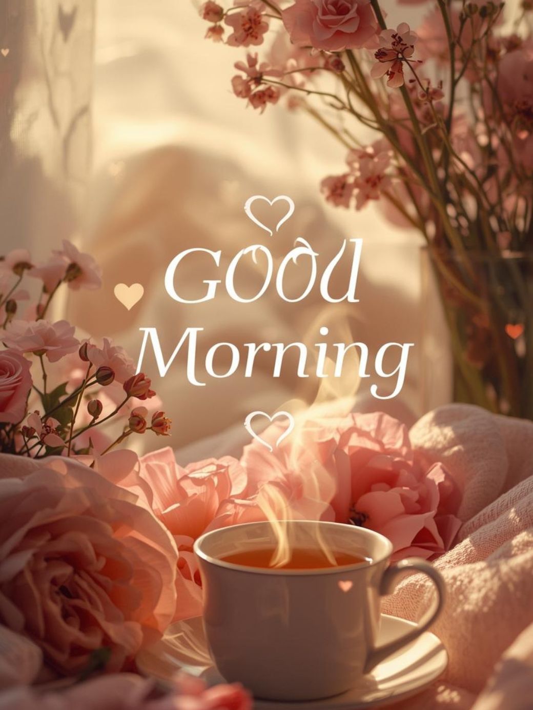 This Lovely Good Morning Image with Tea is a warm and cozy scene designed for loved ones, featuring gentle touches like flowers, a cup of tea , soft sunlight, and subtle hearts. The elegant “Good Morning” text adds a personal, caring touch, while the warm colors and soft lighting create a peaceful, loving, and uplifting atmosphere perfect for sharing with family, friends, or someone special.