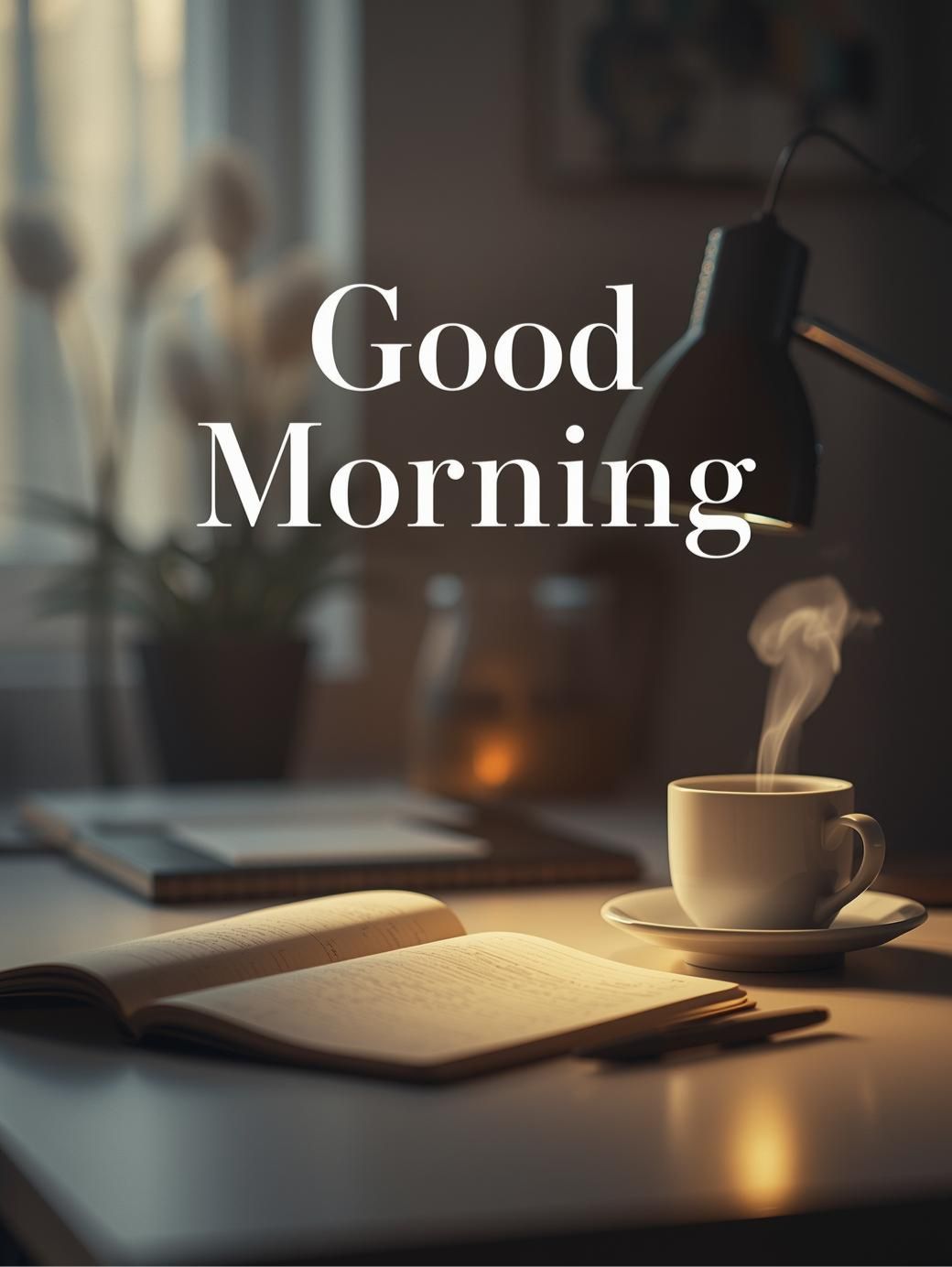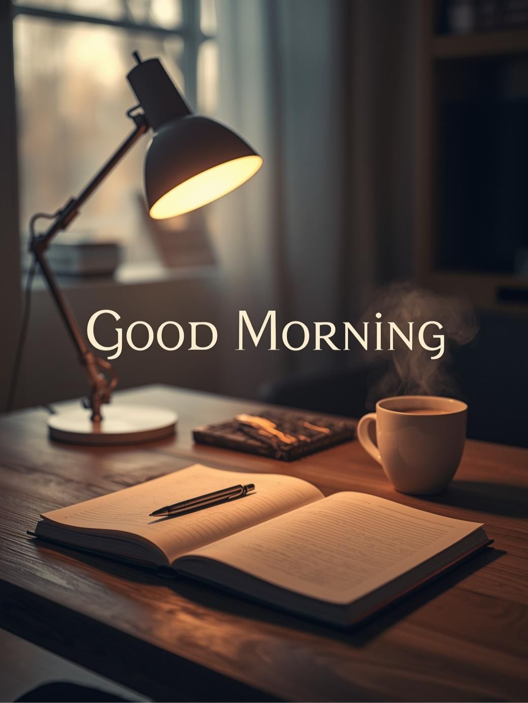 This Motivational Good Morning Image features a cozy and inspiring setup with a notebook, a hot cup of tea, and a table lamp, creating a warm and productive morning vibe. The Good Morning text is written in a beautiful, elegant font that complements the scene. Together, these elements evoke calmness, focus, and positivity, making it a perfect image to start the day with motivation and cheerful energy.