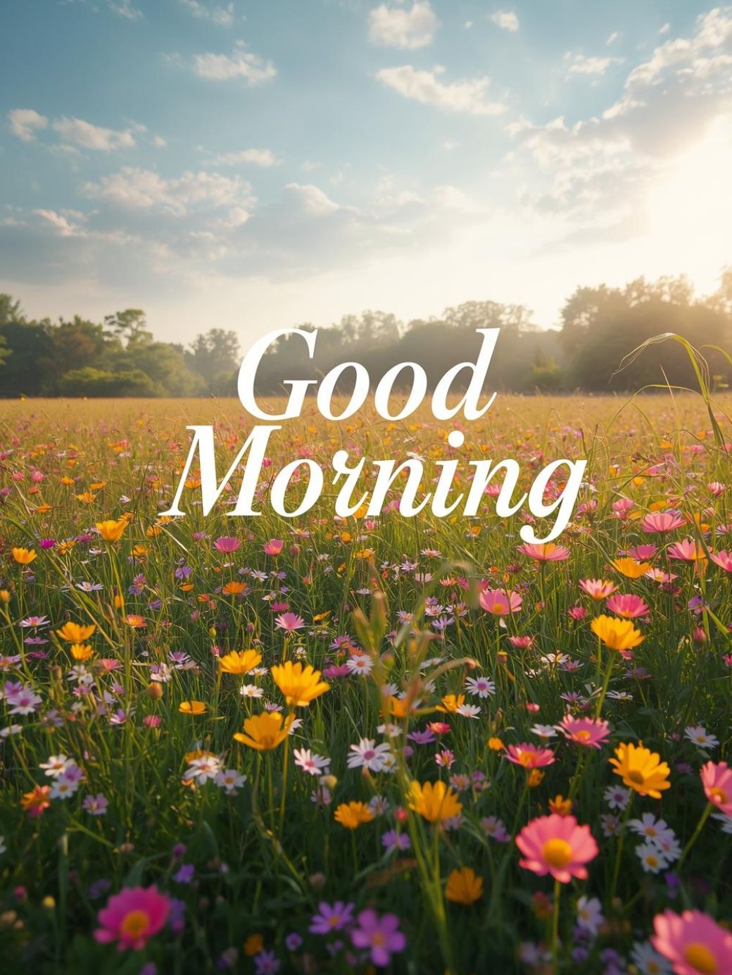 This Good Morning image presents a serene and cheerful meadow, alive with pink, yellow, purple, and white flowers glowing in the soft morning light. The gentle clouds and calm sky add a sense of tranquility and freshness. The stylish “Good Morning” text fits naturally into the scene, while the vibrant yet soothing colors create a feeling of happiness, peace, and optimism—perfect for sending a bright, uplifting morning greeting.