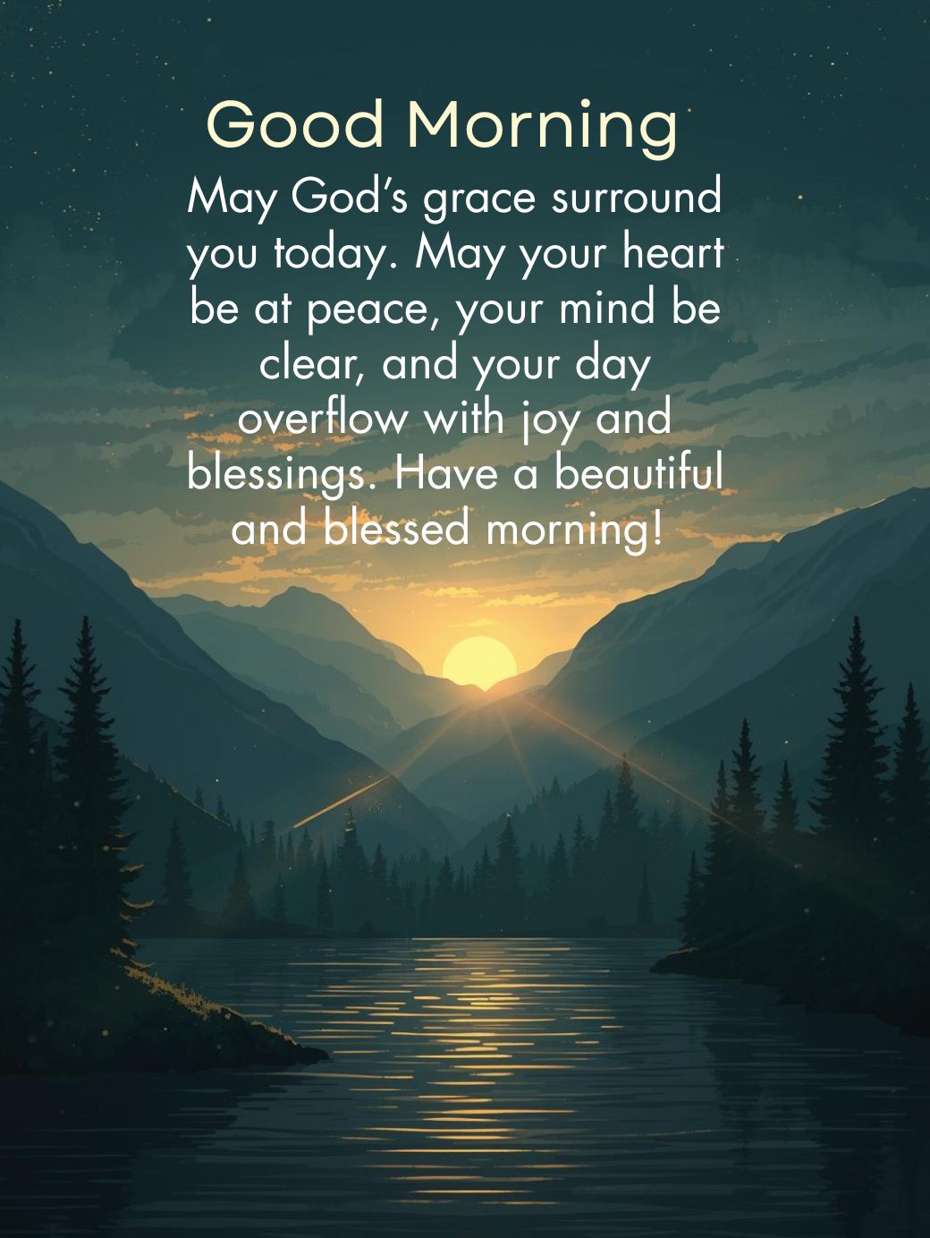 ” May God’s grace surround you today. May your heart be at peace, your mind be clear, and your day overflow with joy and blessings. Have a beautiful and blessed morning!”