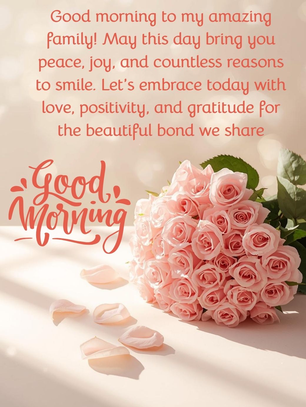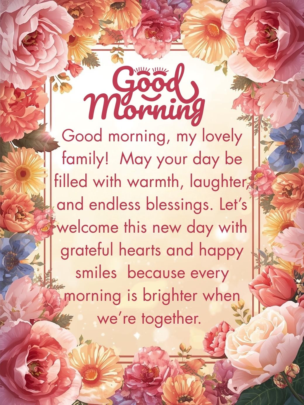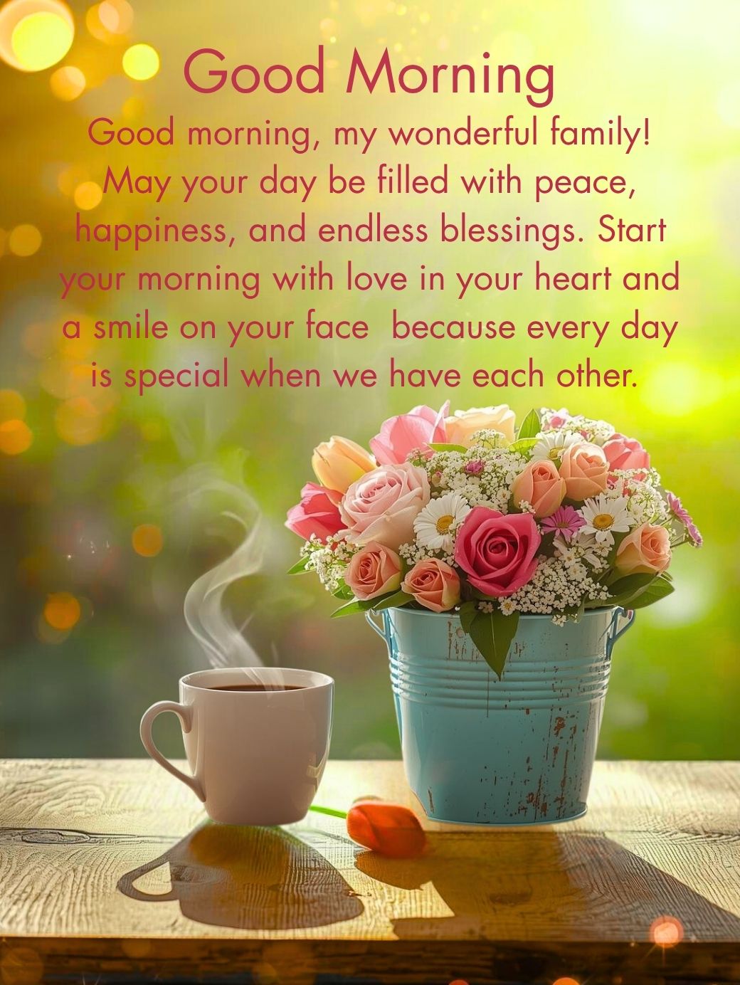 “Good morning, my wonderful family! May your day be filled with peace, happiness, and endless blessings. Start your morning with love in your heart and a smile on your face because every day is special when we have each other.”