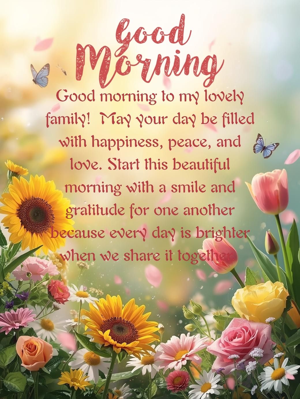 “Good morning to my amazing family! May this day bring you peace, joy, and countless reasons to smile. Let’s embrace today with love, positivity, and gratitude for the beautiful bond we share”