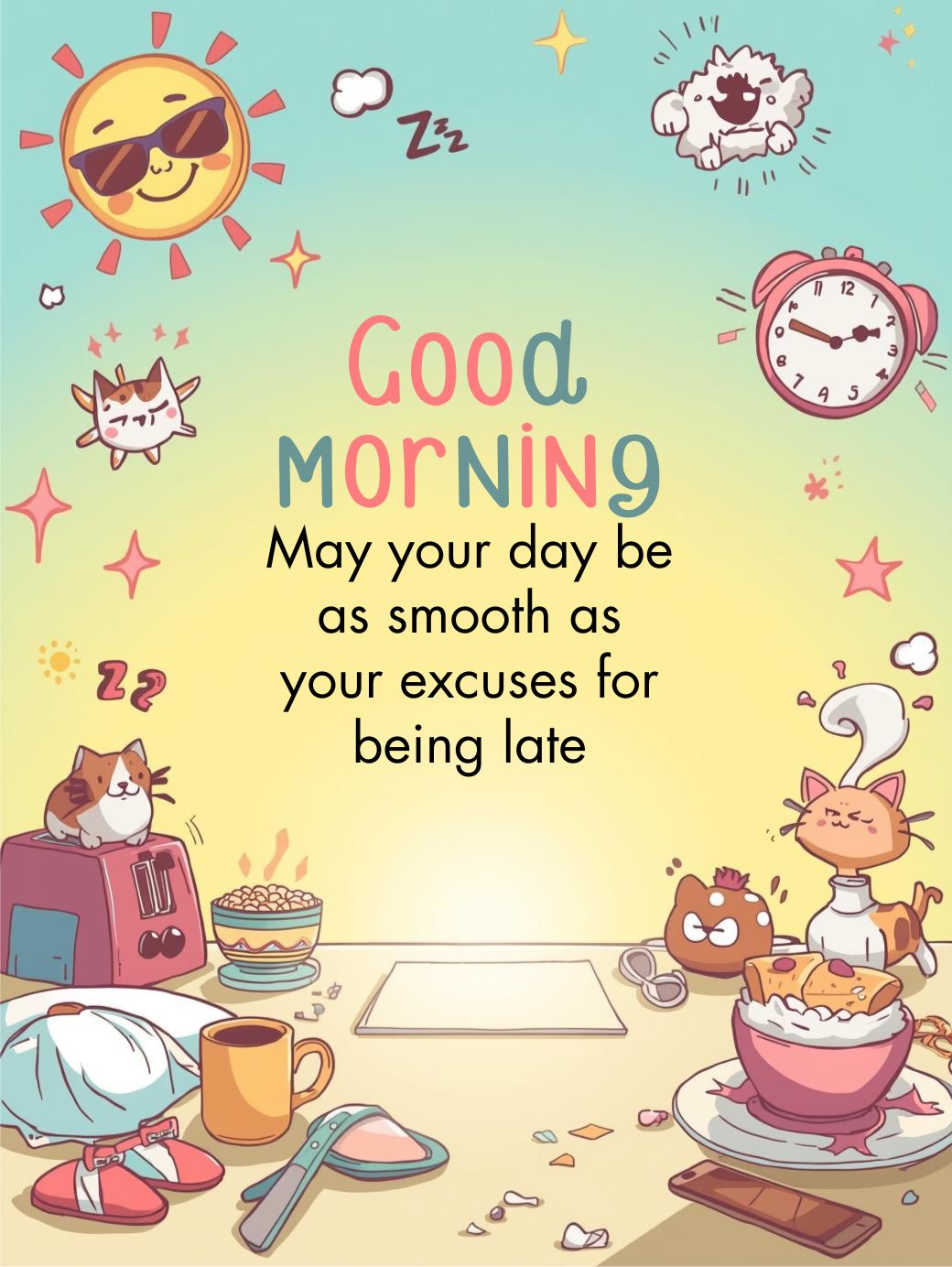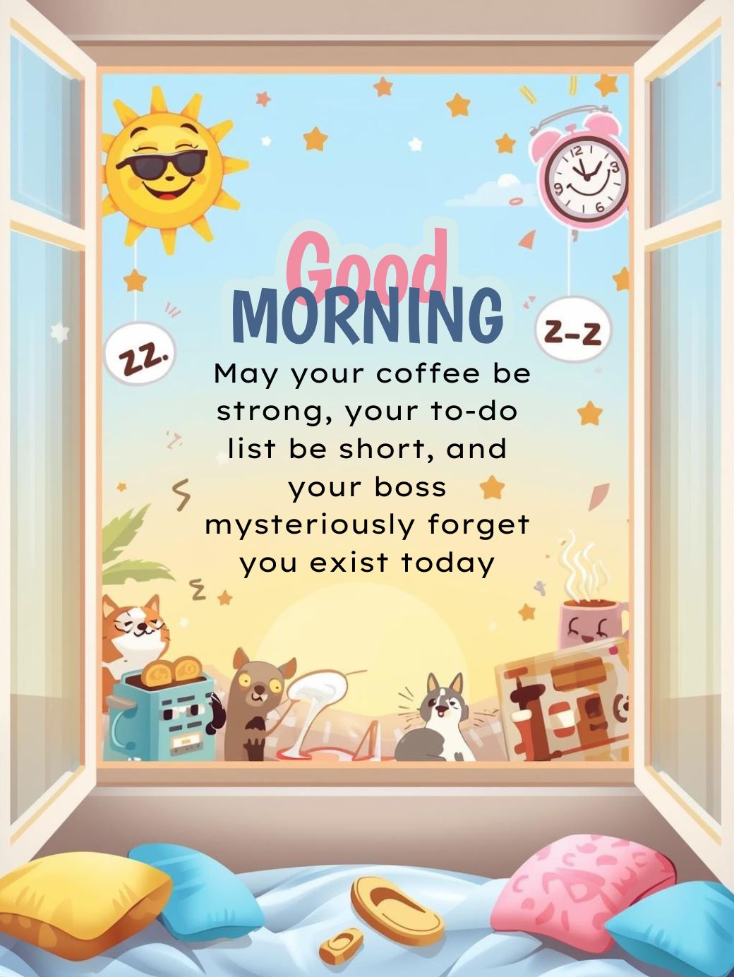 Funny good morning wishes are light-hearted and humorous messages that make mornings more enjoyable and cheerful. They’re perfect for sharing laughs with friends, family, or coworkers, helping everyone start the day with a smile. Whether it’s a witty joke about coffee, a playful remark about waking up early, or a hilarious quote about Mondays, funny good morning messages add joy and energy to the morning routine. A little humor can instantly lift moods, reduce stress, and turn even the sleepiest start into a happy and positive beginning to the day.