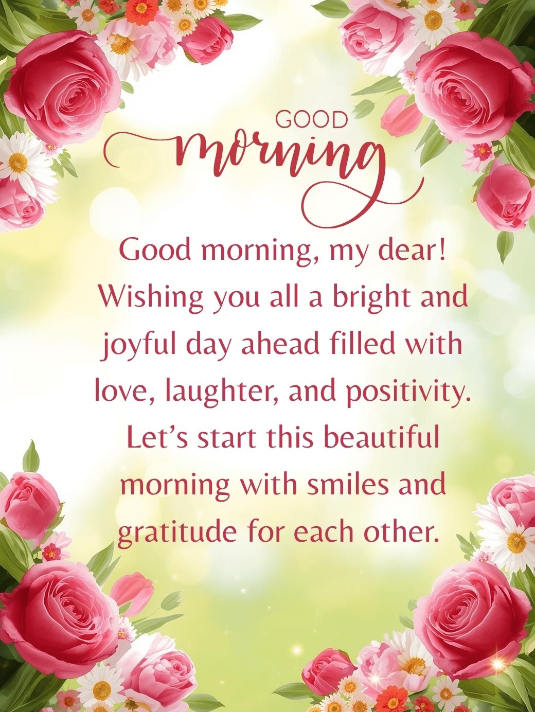 “Good morning, my dear! Wishing you all a bright and joyful day ahead filled with love, laughter, and positivity. Let’s start this beautiful morning with smiles and gratitude for each other.”