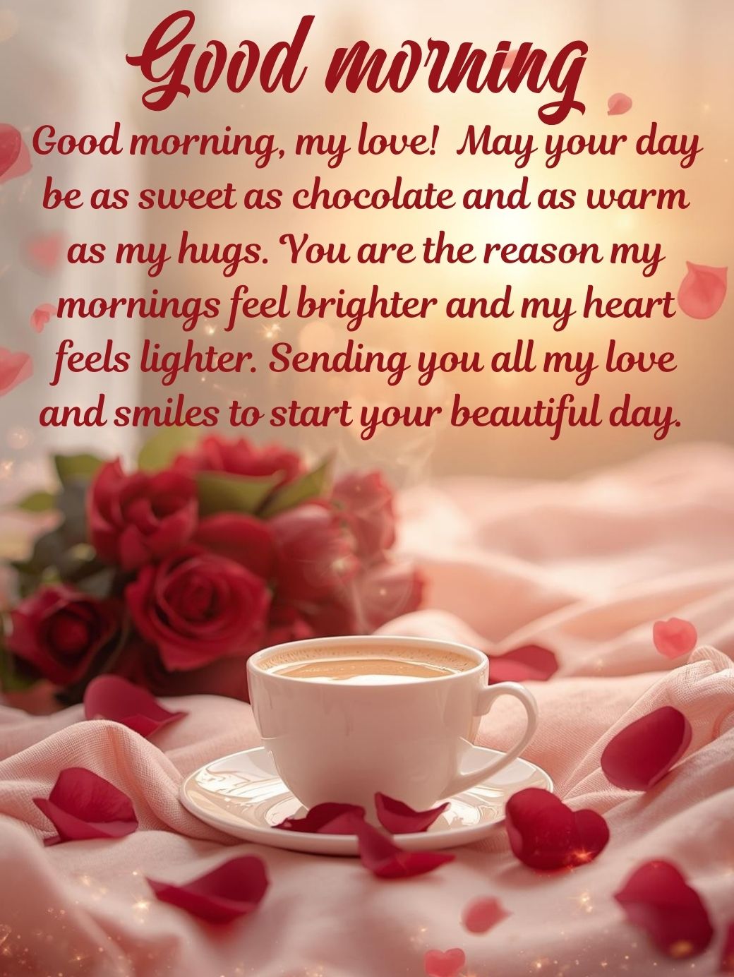 “Good morning, my love! May your day be as sweet as chocolate and as warm as my hugs. You are the reason my mornings feel brighter and my heart feels lighter. Sending you all my love and smiles to start your beautiful day.”