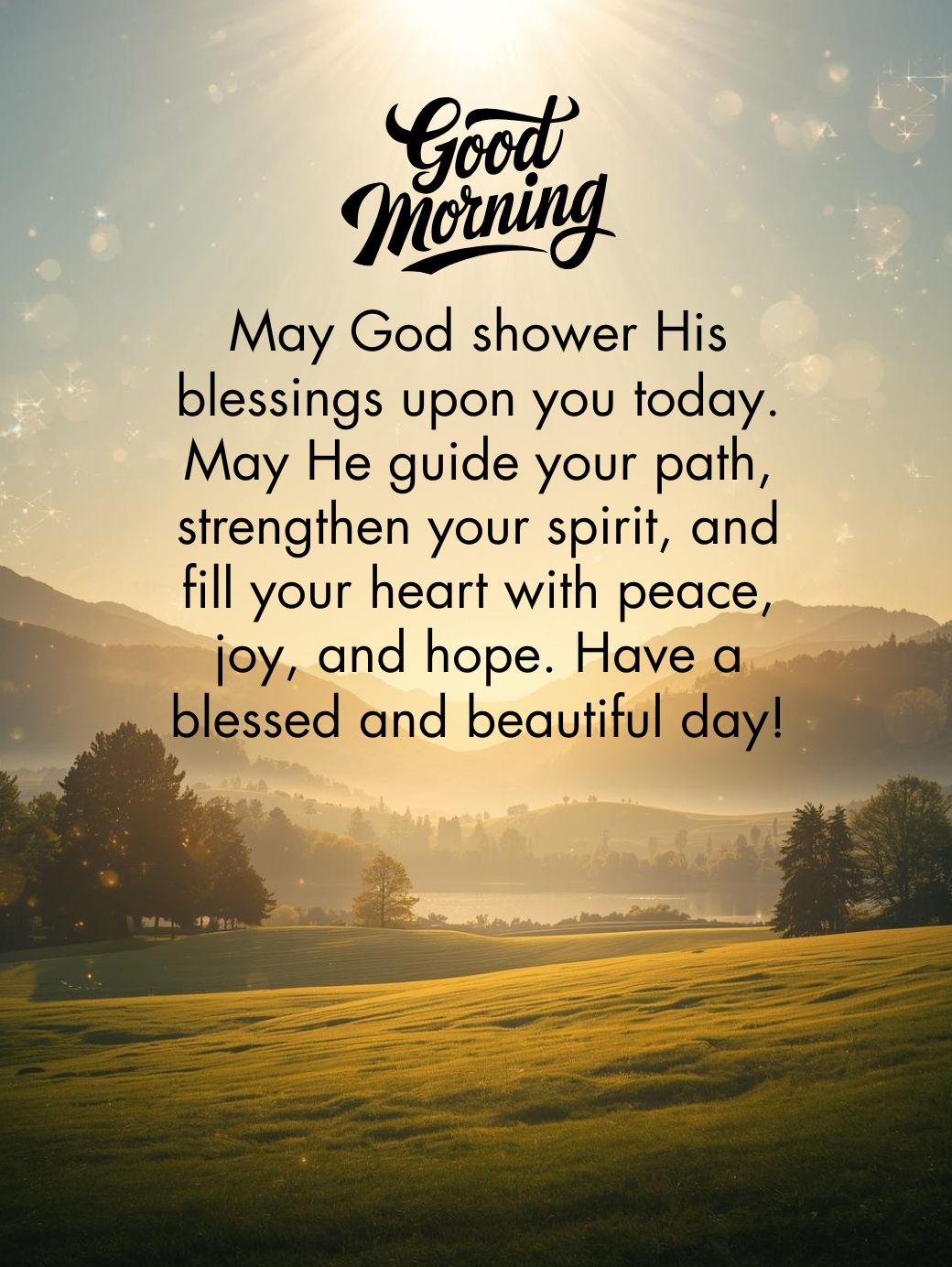 ” May God shower His blessings upon you today. May He guide your path, strengthen your spirit, and fill your heart with peace, joy, and hope. Have a blessed and beautiful day!”