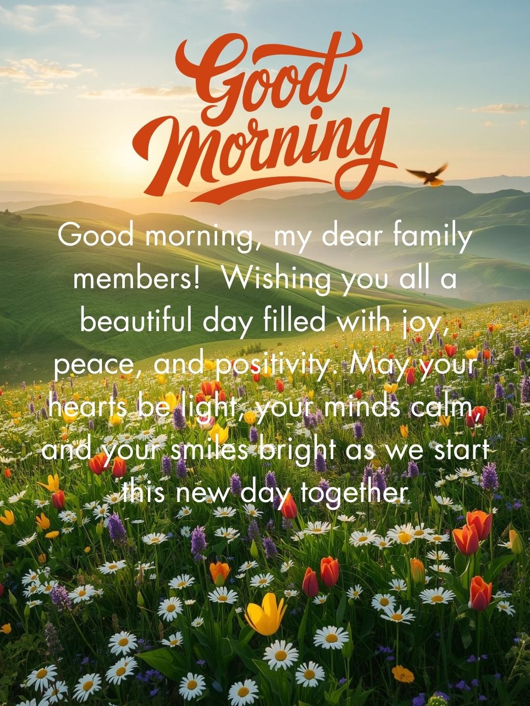 “Good morning, my dear family members! Wishing you all a beautiful day filled with joy, peace, and positivity. May your hearts be light, your minds calm, and your smiles bright as we start this new day together”