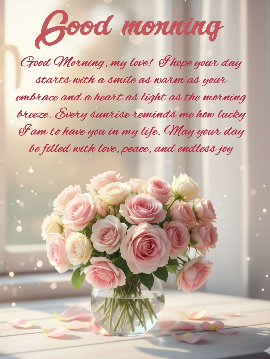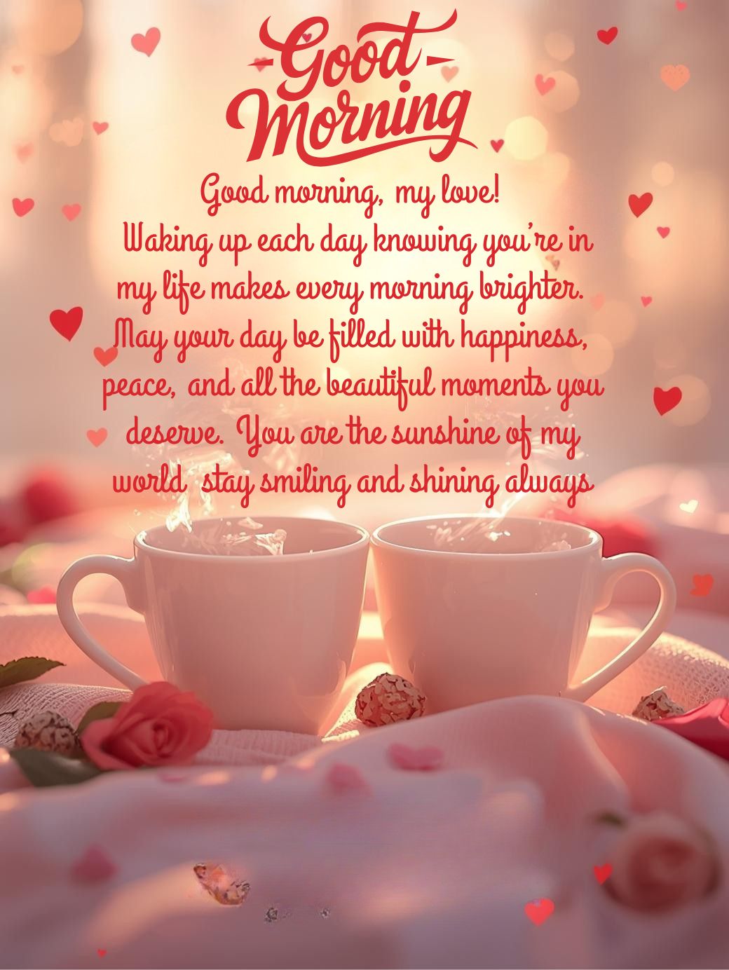 “Good morning, my love!Waking up each day knowing you’re in my life makes every morning brighter. May your day be filled with happiness, peace, and all the beautiful moments you deserve. You are the sunshine of my world stay smiling and shining always”