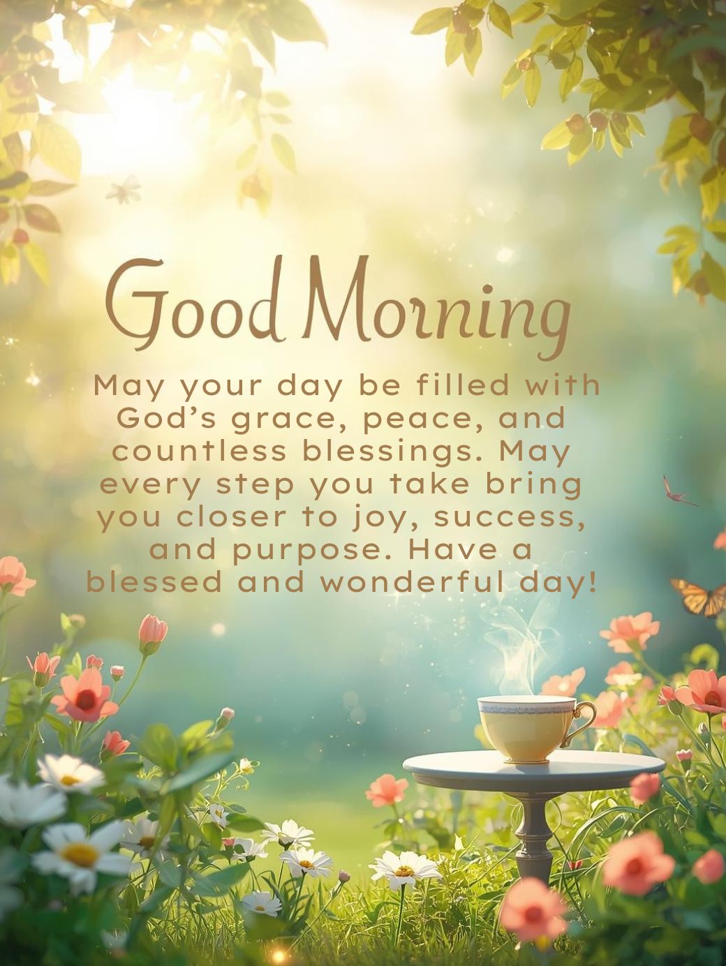 “May your day be filled with God’s grace, peace, and countless blessings. May every step you take bring you closer to joy, success, and purpose. Have a blessed and wonderful day!”