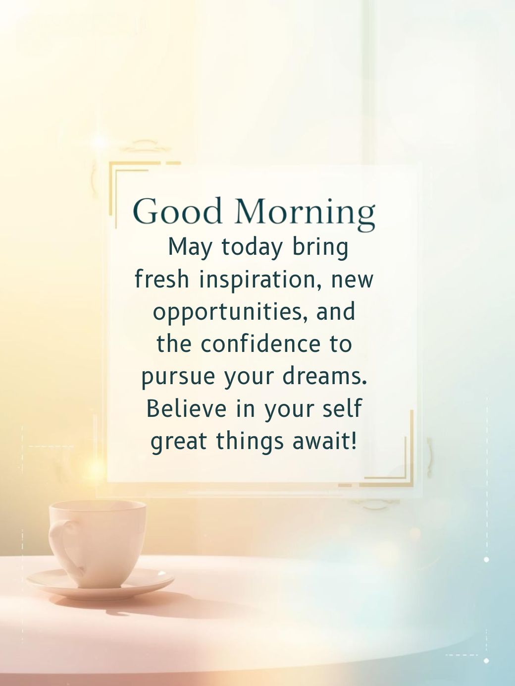 ” May today bring fresh inspiration, new opportunities, and the confidence to pursue your dreams. Believe in your self great things await!”