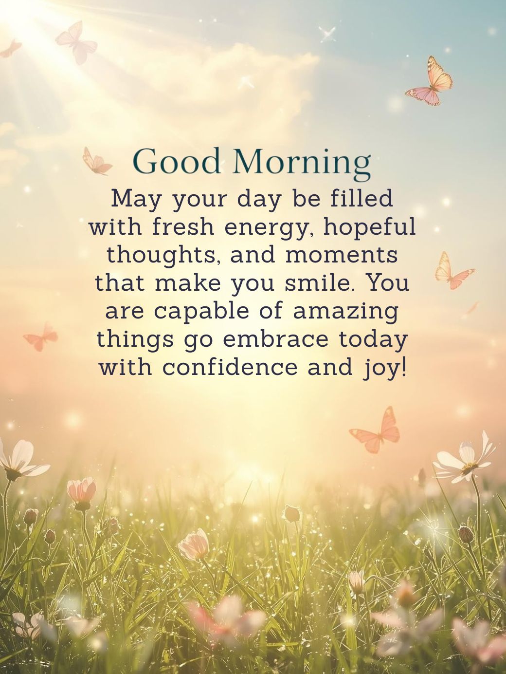 ” May your day be filled with fresh energy, hopeful thoughts, and moments that make you smile. You are capable of amazing things go embrace today with confidence and joy!”