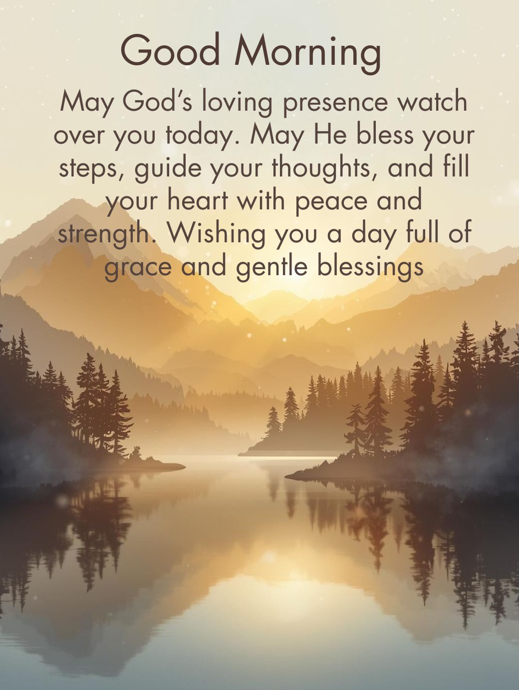 “May God’s loving presence watch over you today. May He bless your steps, guide your thoughts, and fill your heart with peace and strength. Wishing you a day full of grace and gentle blessings “