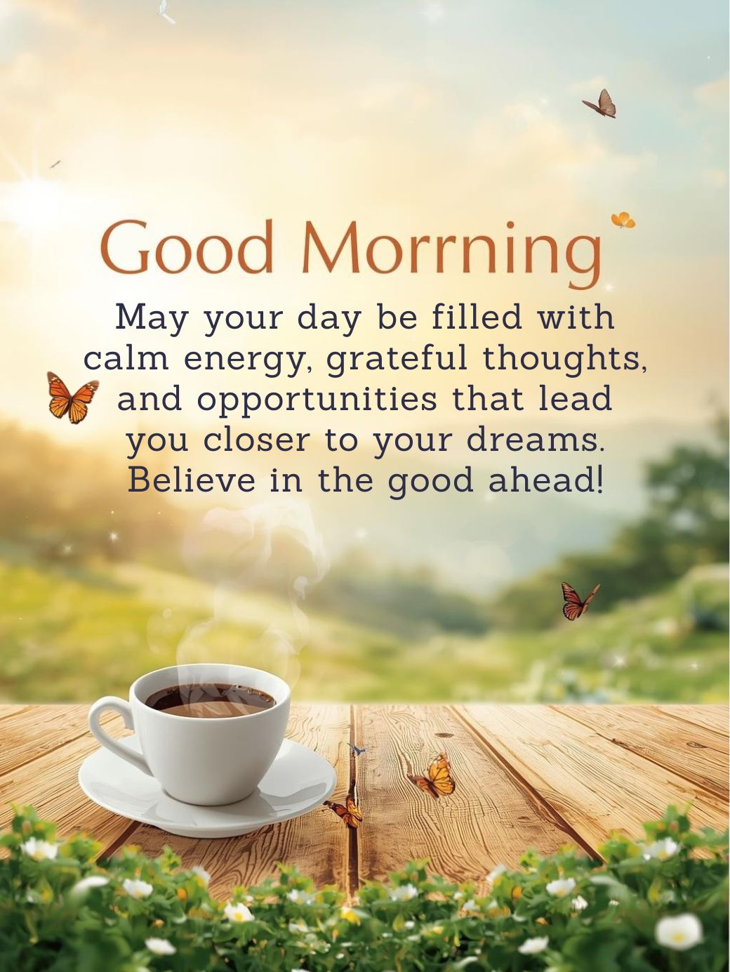 ” May your day be filled with calm energy, grateful thoughts, and opportunities that lead you closer to your dreams. Believe in the good ahead!”