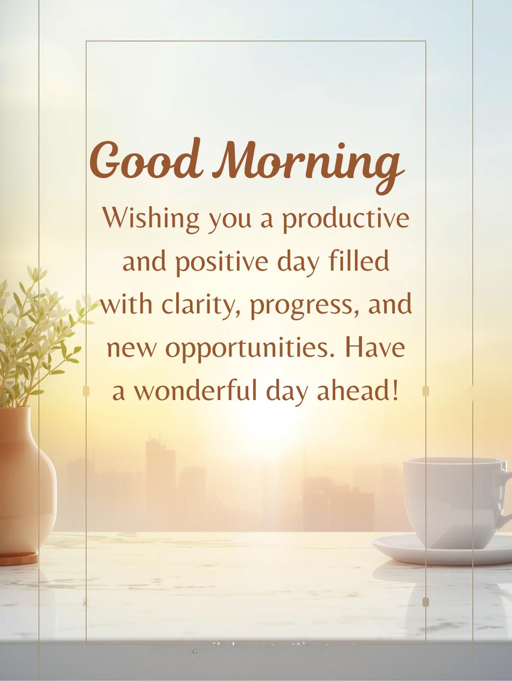 “Wishing you a productive and positive day filled with clarity, progress, and new opportunities. Have a wonderful day ahead! “