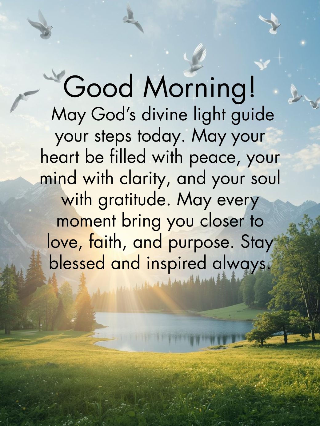 “May God’s divine light guide your steps today. May your heart be filled with peace, your mind with clarity, and your soul with gratitude. May every moment bring you closer to love, faith, and purpose. Stay blessed and inspired always. “