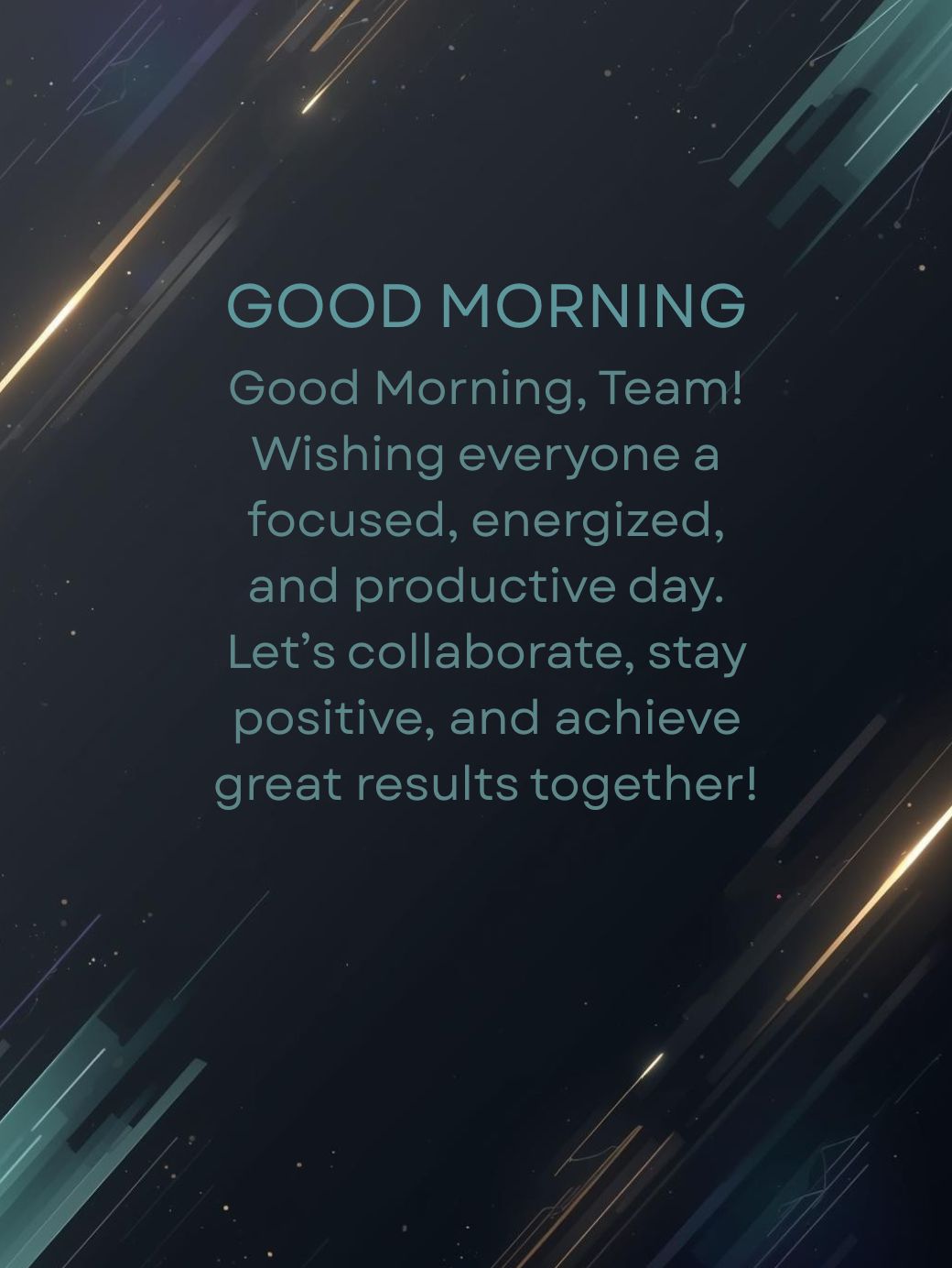 “Good Morning, Team! Wishing everyone a focused, energized, and productive day. Let’s collaborate, stay positive, and achieve great results together! “