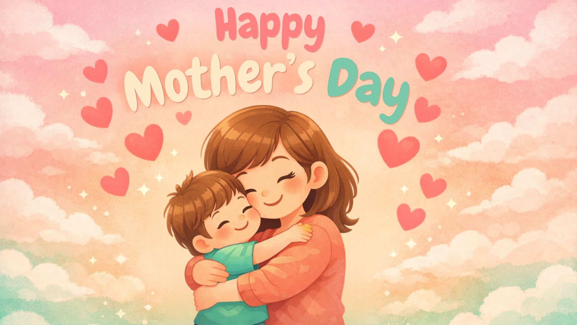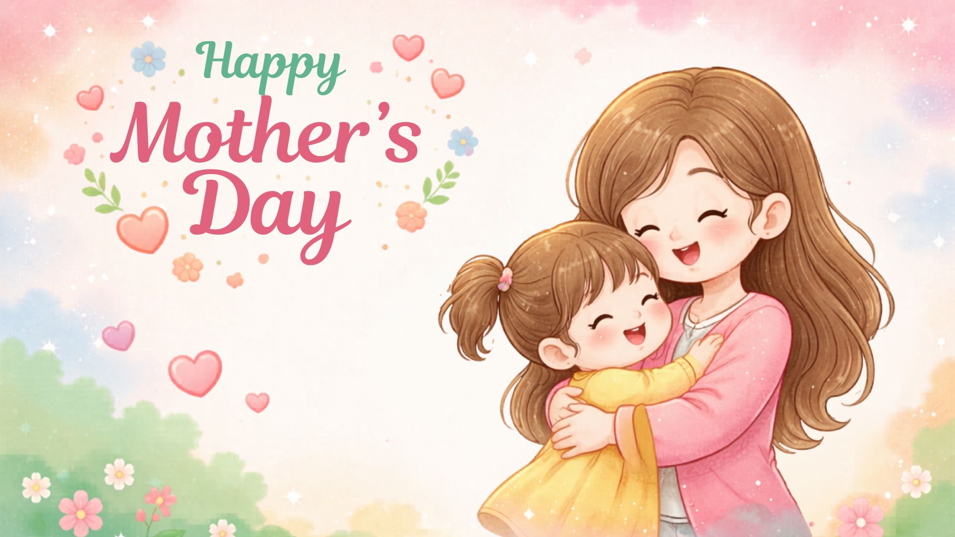 This adorable Mother’s Day wallpaper shows a loving illustration of a mother hugging her child in a warm and emotional moment. Soft pastel colors and a cheerful art style create a joyful atmosphere filled with love. The friendly “Happy Mother’s Day” text adds a sweet finishing touch to this heartwarming design.