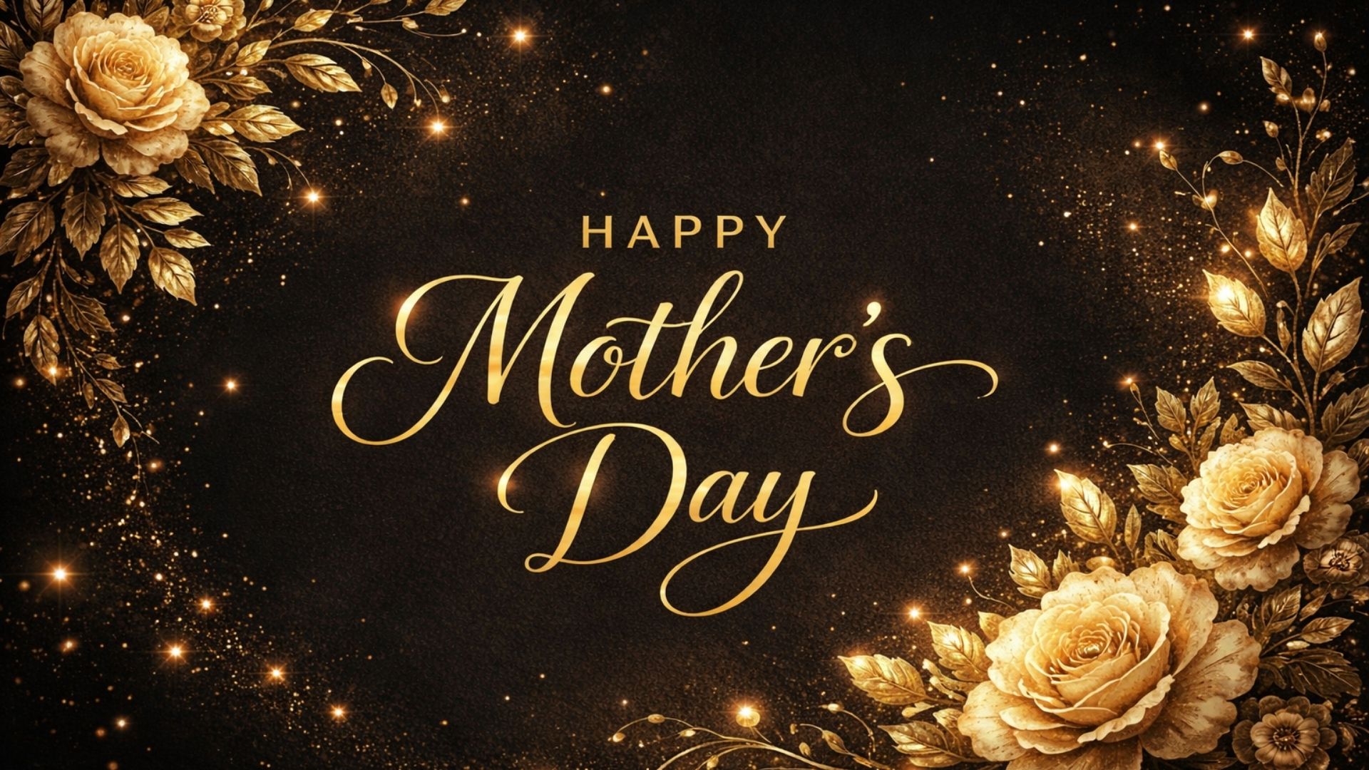 This luxury Mother’s Day wallpaper features a deep black background highlighted with glowing gold floral decorations. The elegant golden typography of “Happy Mother’s Day” creates a rich and sophisticated greeting card style. With its dramatic lighting and sparkling gold details, this wallpaper feels premium and perfect for celebrating mothers in a grand way.