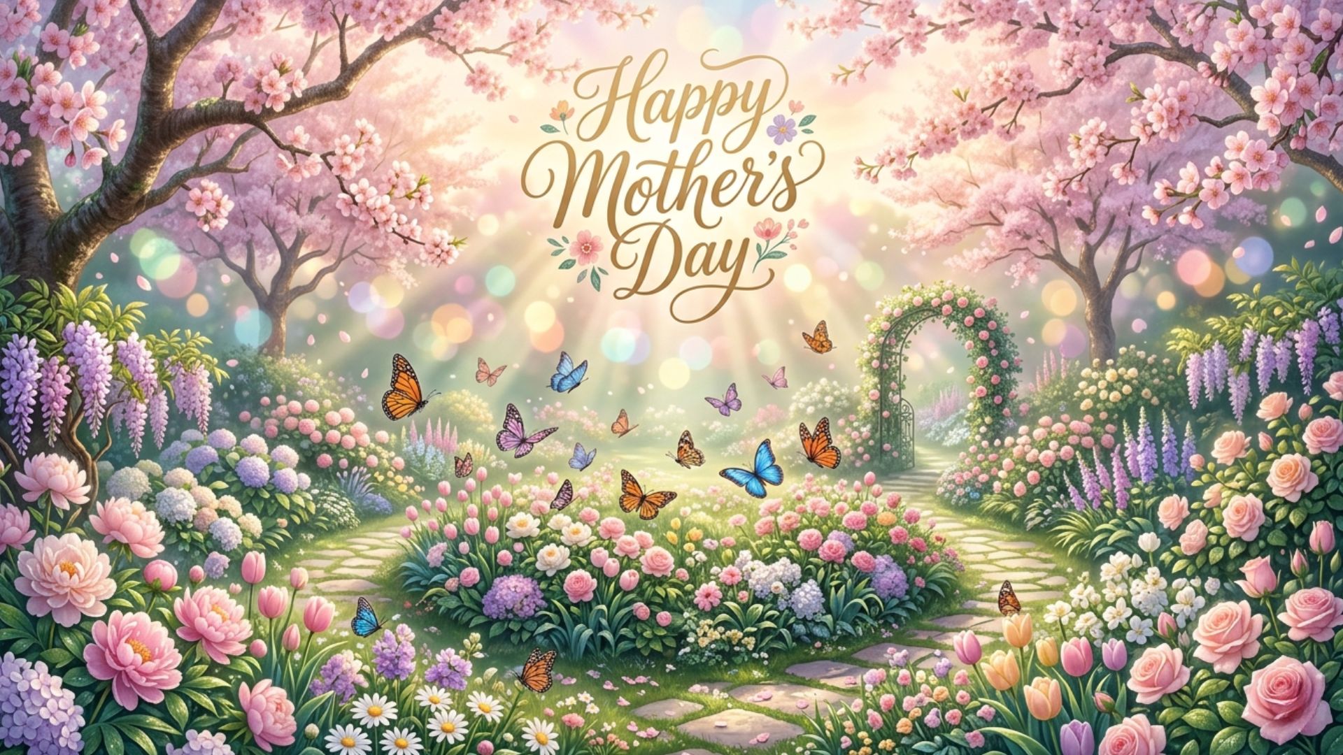 This dreamy Mother’s Day background wallpaper captures the beauty of a blooming spring garden filled with butterflies and colorful flowers. Soft sunlight and pastel tones create a peaceful and magical mood. The flowing “Happy Mother’s Day” typography blends naturally with the floral scene, celebrating nature and love together.