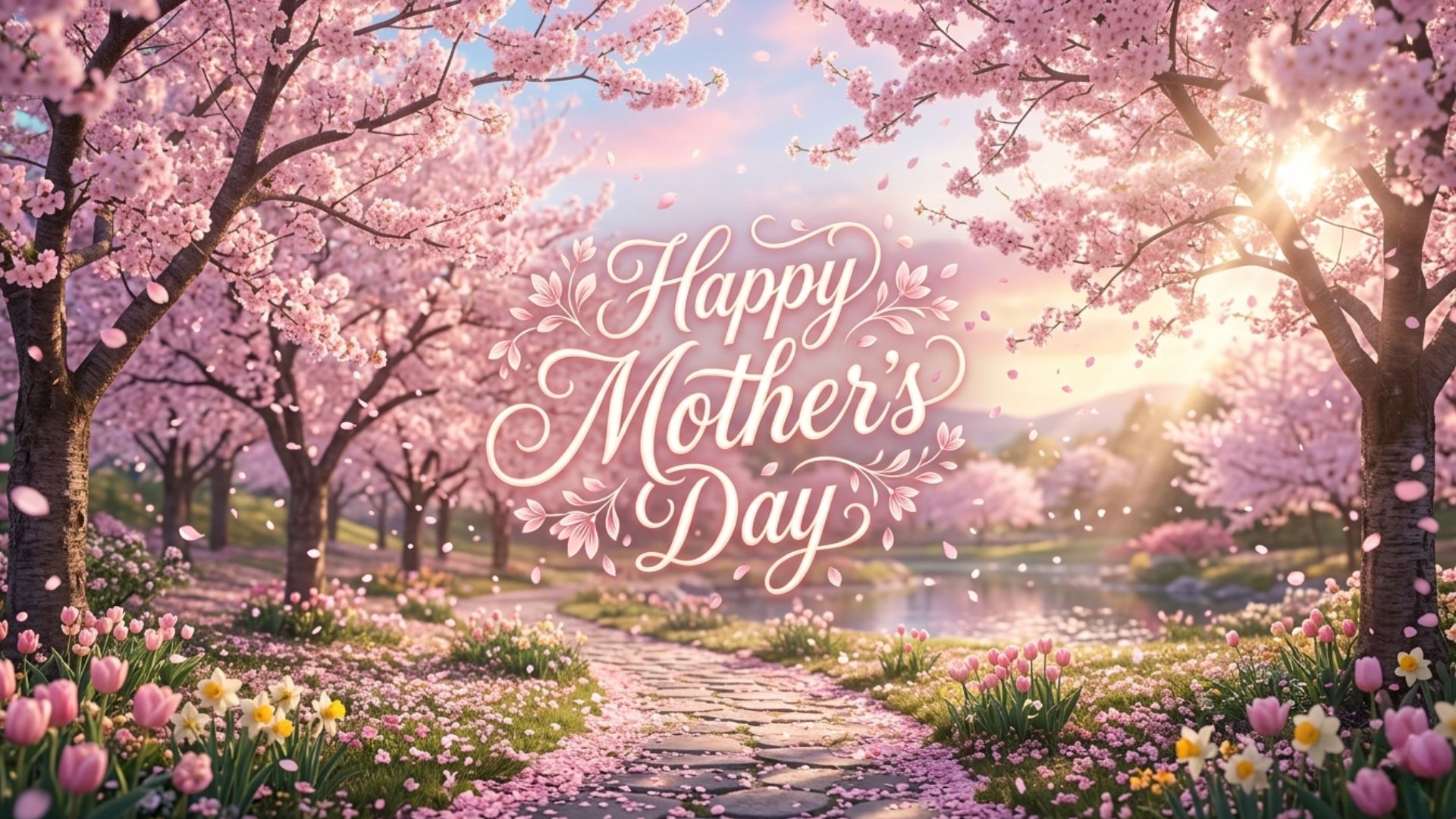 This soft and romantic Mother’s Day wallpaper background features delicate cherry blossom petals gently falling in a glowing spring atmosphere. The pastel pink flowers and warm sunlight create a peaceful and elegant design. The graceful “Happy Mother’s Day” typography blends beautifully with the blossoms, symbolizing love, beauty, and new beginnings.