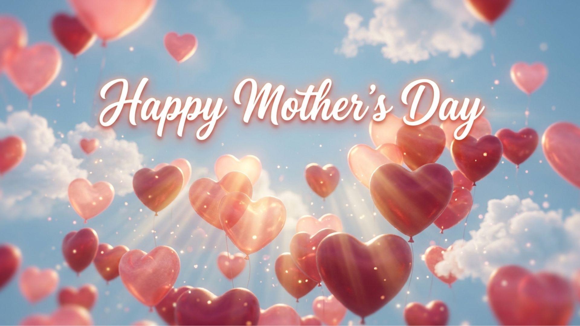 This festive Mother’s Day wallpaper background features pink and red heart-shaped balloons floating across a bright sky. The soft sunlight and gentle clouds create a magical celebration scene. The elegant “Happy Mother’s Day” message appears among the floating balloons, symbolizing love rising high and filling the sky.