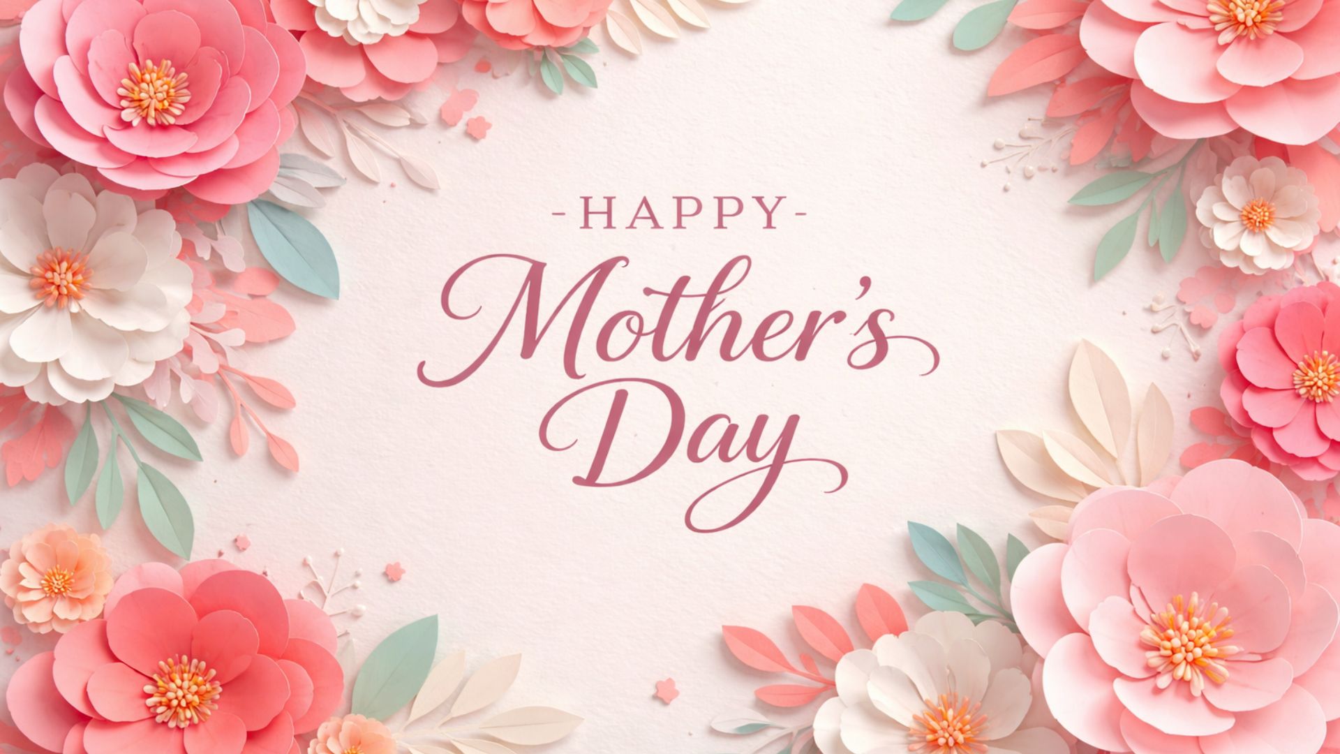 This creative Mother’s Day background is inspired by layered paper cut art with beautiful floral shapes and soft shadows. The pastel colors and handcrafted look make the wallpaper feel artistic and modern at the same time. The “Happy Mother’s Day” typography sits perfectly in the center, completing the charming paper craft style.