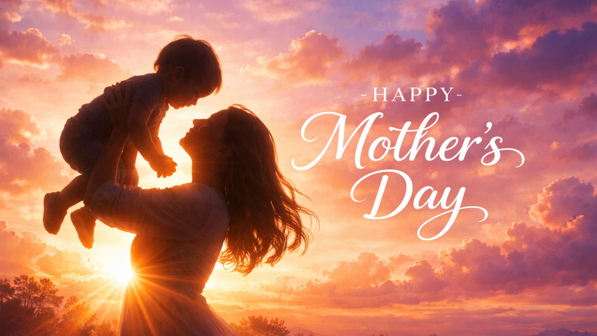 This emotional Mother’s Day wallpaper shows the silhouette of a mother holding her child against a breathtaking sunset sky. Warm shades of orange, purple, and gold create a peaceful and touching moment. The “Happy Mother’s Day” message adds a meaningful finishing touch to this beautiful symbol of love and care.