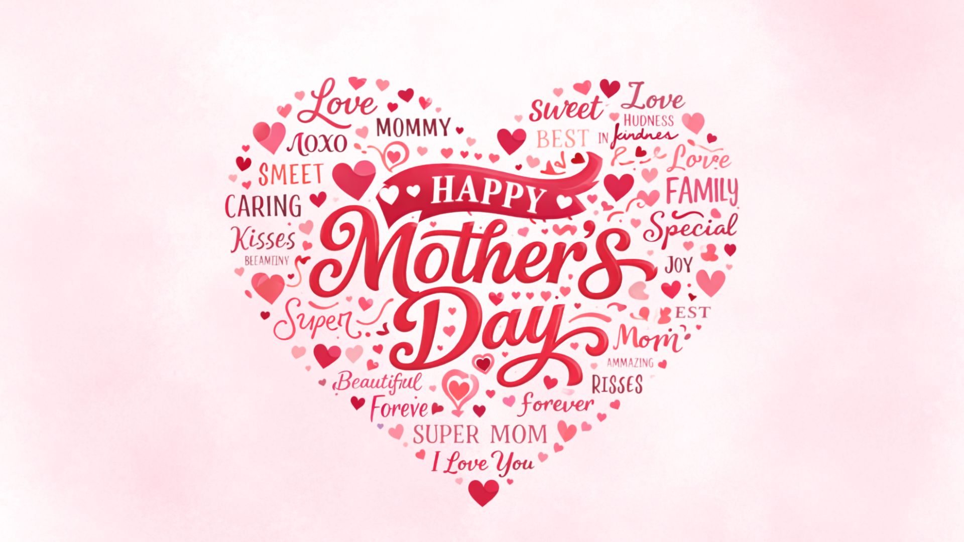 This creative Mother’s Day love wallpaper forms a large heart shape using many small words and phrases about love and gratitude. The vibrant pink and red colors make the design modern and eye-catching. At the center, the message “Happy Mother’s Day” stands proudly as the main expression of appreciation.