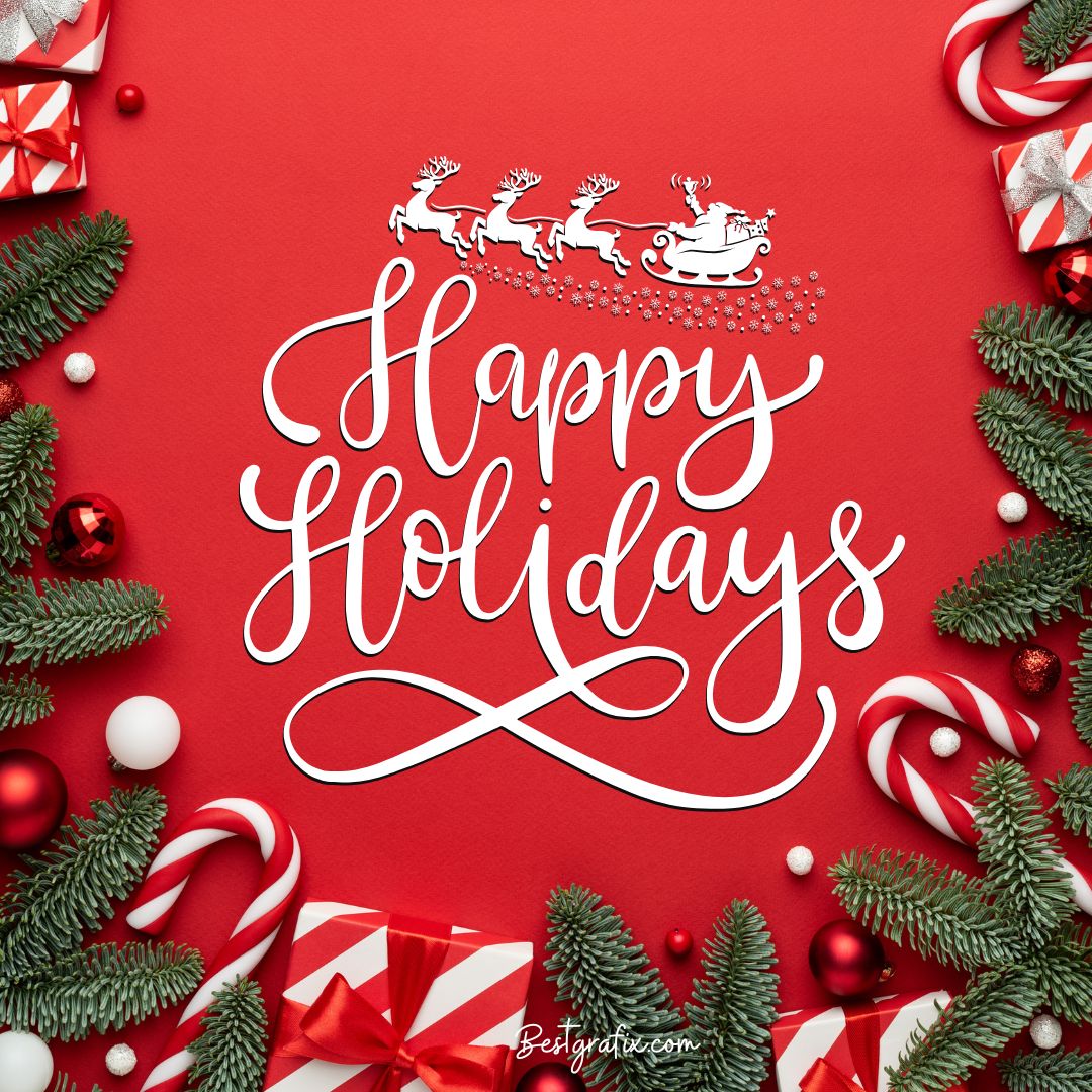 This Merry Christmas greetings image features the phrase Happy Holiday written in crisp white text, creating a bright and cheerful focal point. Above the message, Santa and his reindeer are shown flying gracefully, adding a magical festive touch. The design is beautifully enhanced with Christmas tree leaves, colorful ornaments, and gift decorations, giving the entire image a warm, joyful, and celebratory holiday feel.