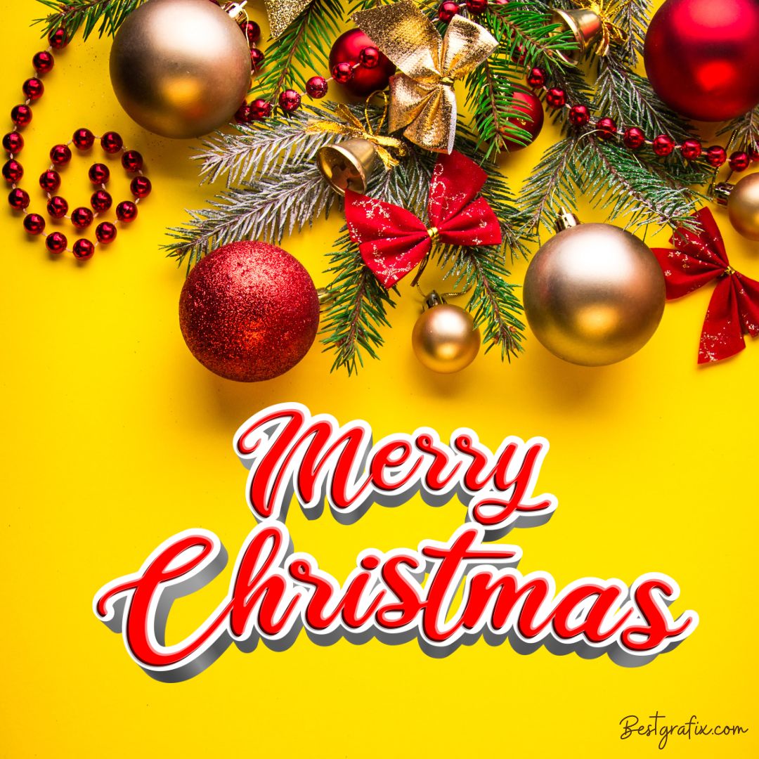 This free Christmas wishes image features a festive combination of holiday decorations, including Christmas tree leaves, colorful ornaments, and shining bells. The phrase Merry Christmas is written in bold red text with a yellow font style, making it stand out beautifully. Overall, the design creates a bright, cheerful, and joyful holiday mood