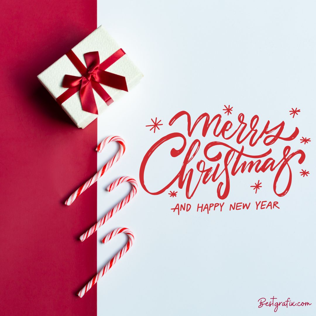 This Christmas image is created in festive red and white colors, featuring beautifully arranged gifts and candy cane decorations. The message Merry Christmas and Happy New Year is written in bold red text, making it stand out perfectly. The overall design captures the joyful spirit of both Christmas and the New Year, making it ideal for warm holiday greetings